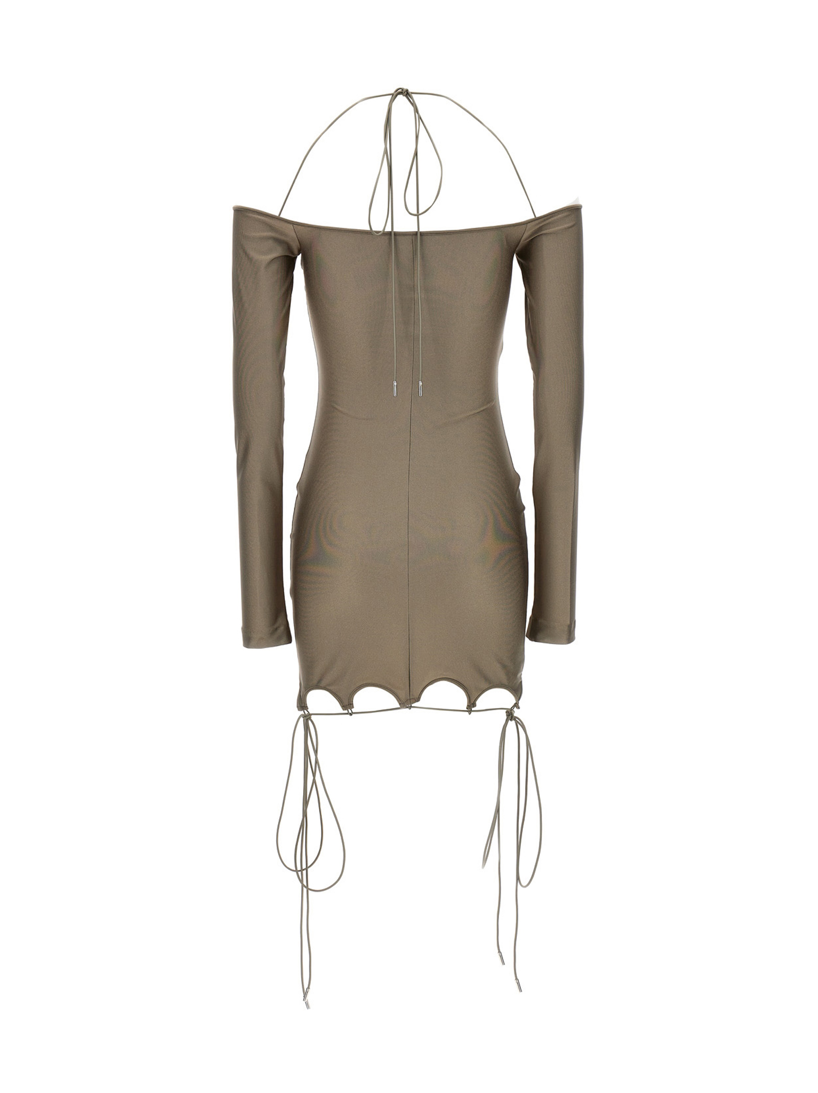 Lyna’ shiny military lycra dress with flared neckline and hem and metal logo final.