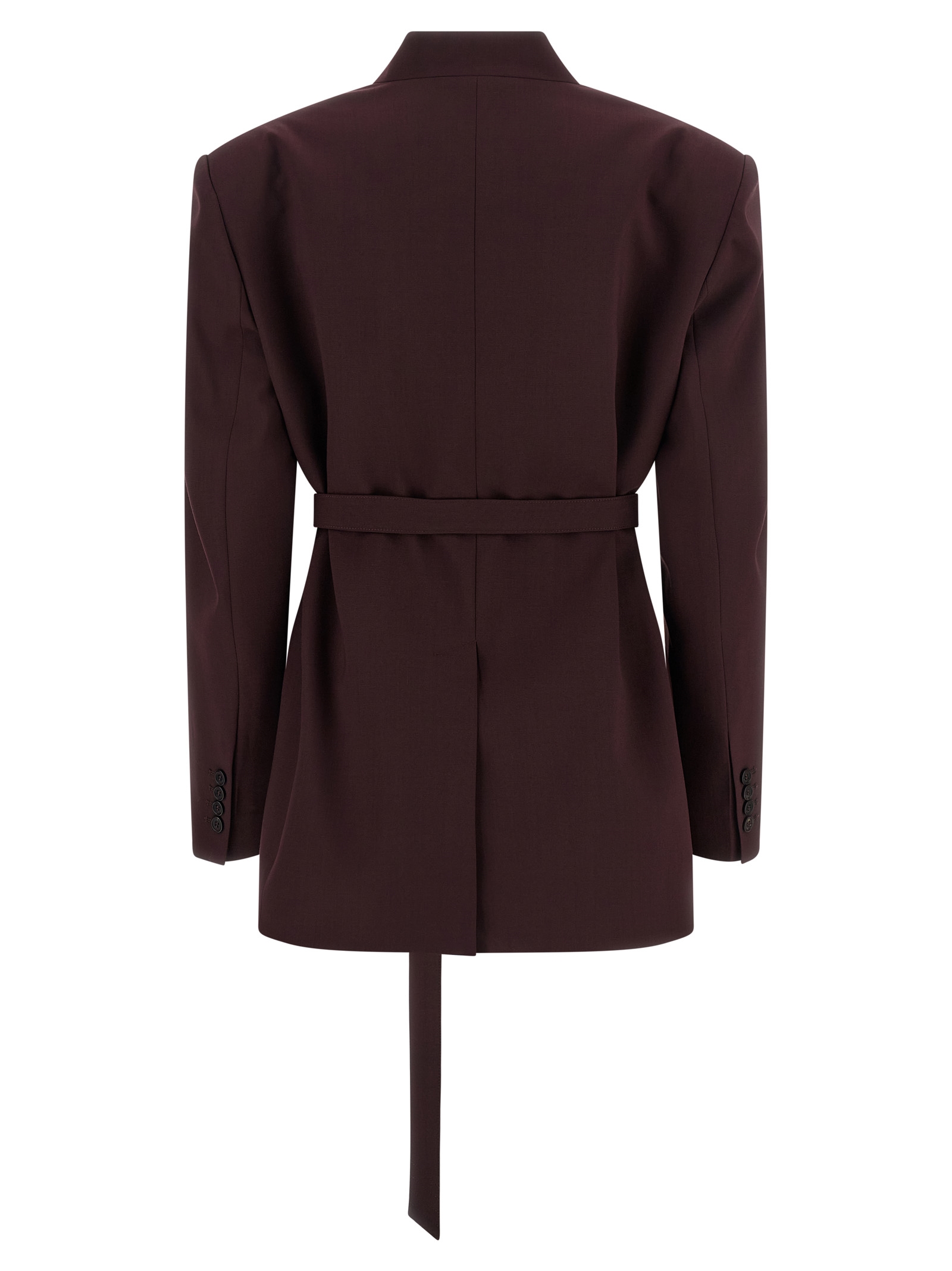 Single-breasted wool gabardine blazer with front asymmetric button closure, Monogram viscose lining, Standing collar, Pocket with metal plaque with engraved logo, Flap pockets, Maxi padded shoulder strap, Long sleeves, Back split, Removable matching belt. Size and Fit – oversized fit