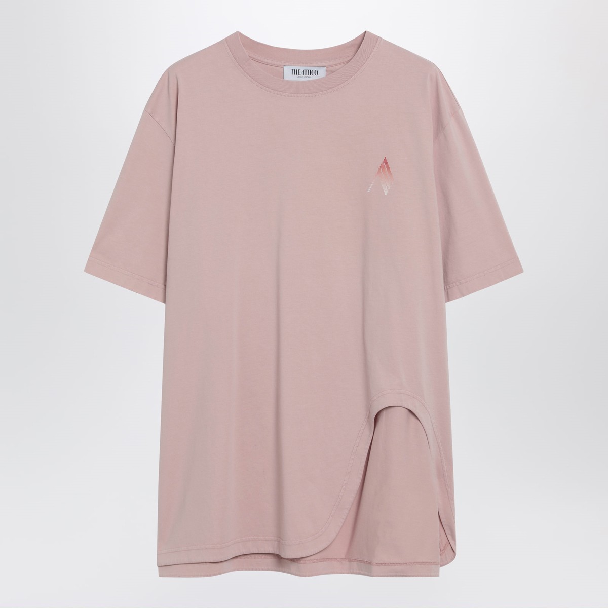 The Attico pink cotton T-shirt featuring a crew neck, short sleeves, logo print on the chest, back print and shaped hem.
