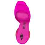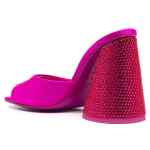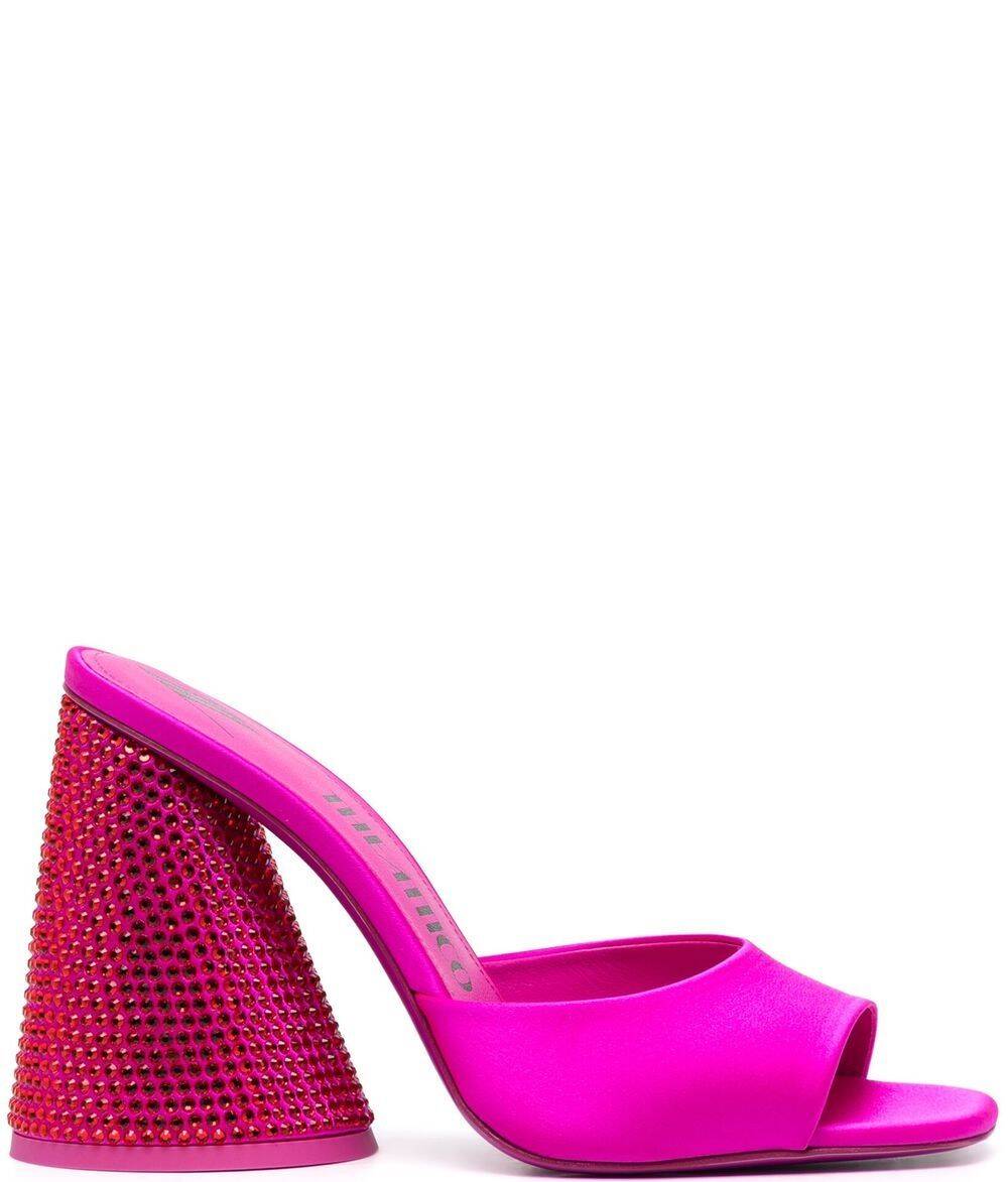 Luz 105mm crystal-embellished satin mules from The Attico featuring fuchsia pink, bright red, calf leather, satin finish, crystal embellishment, open toe, branded insole, slip-on style and 105mm cylindrical heel. Luz crystal embellished satin mules