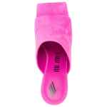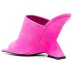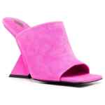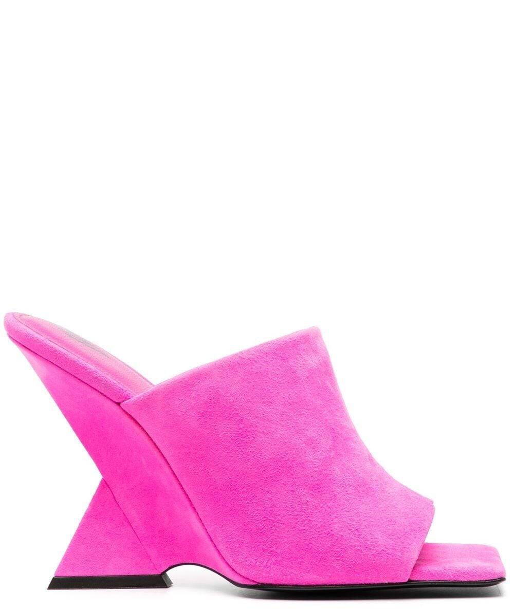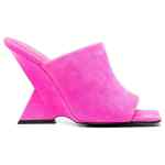 Cheope 105mm square-toe mules from The Attico featuring fuchsia pink, calf leather, suede panelling, open toe, square toe, slip-on style and high sculpted heel. Cheope suede mules