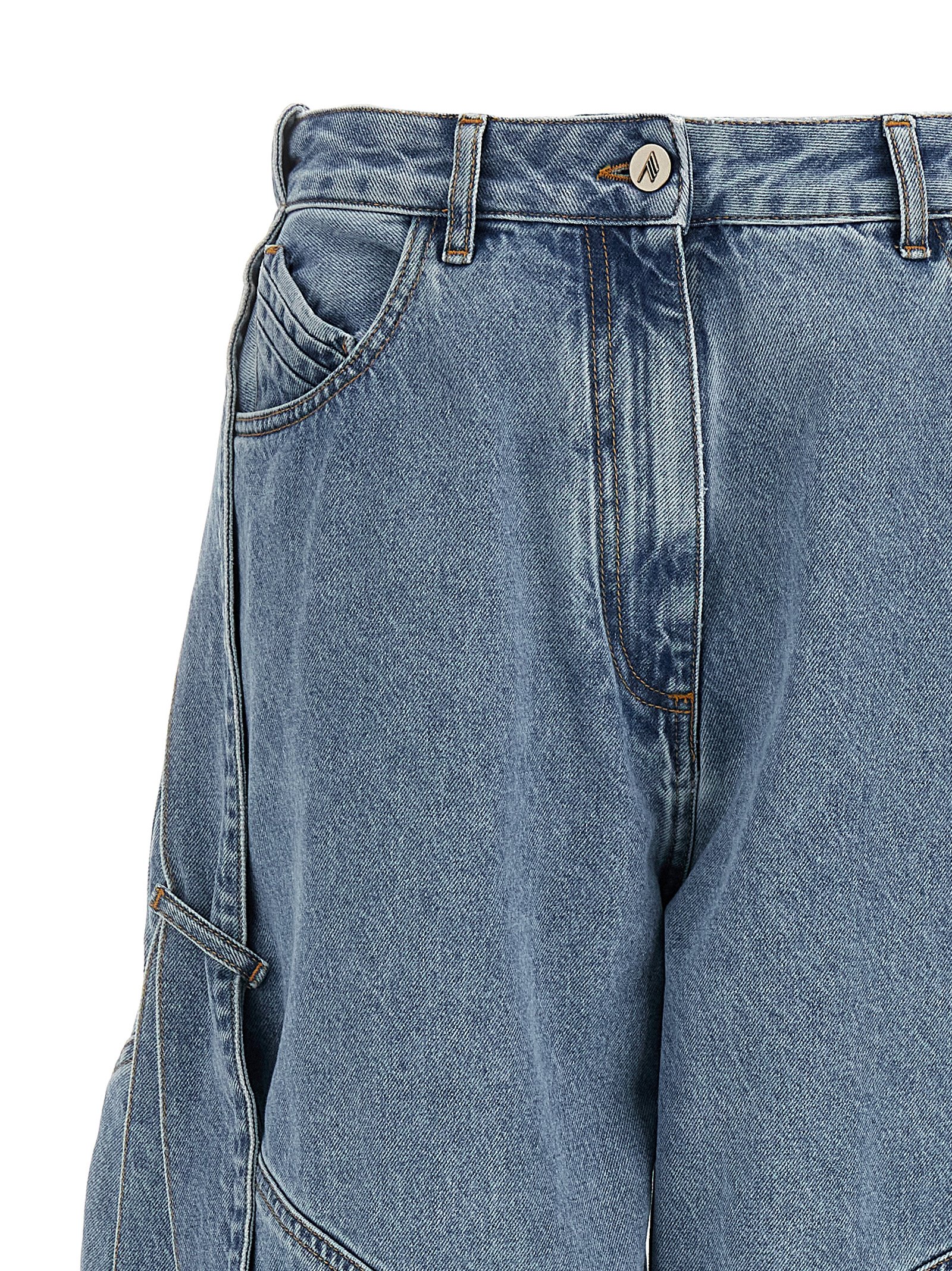 Washed cotton denim jeans with tape details, low crotch, zip and front button closure, five pockets, wide leg with ankle narrowing, back leather logo tag.