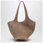 Medium bag by The Attico in tobacco suede, featuring two top handles, flat inner pocket, metal logo detail at the base, tone-on-tone embossed front logo, top zip closure, and silver-tone hardware.