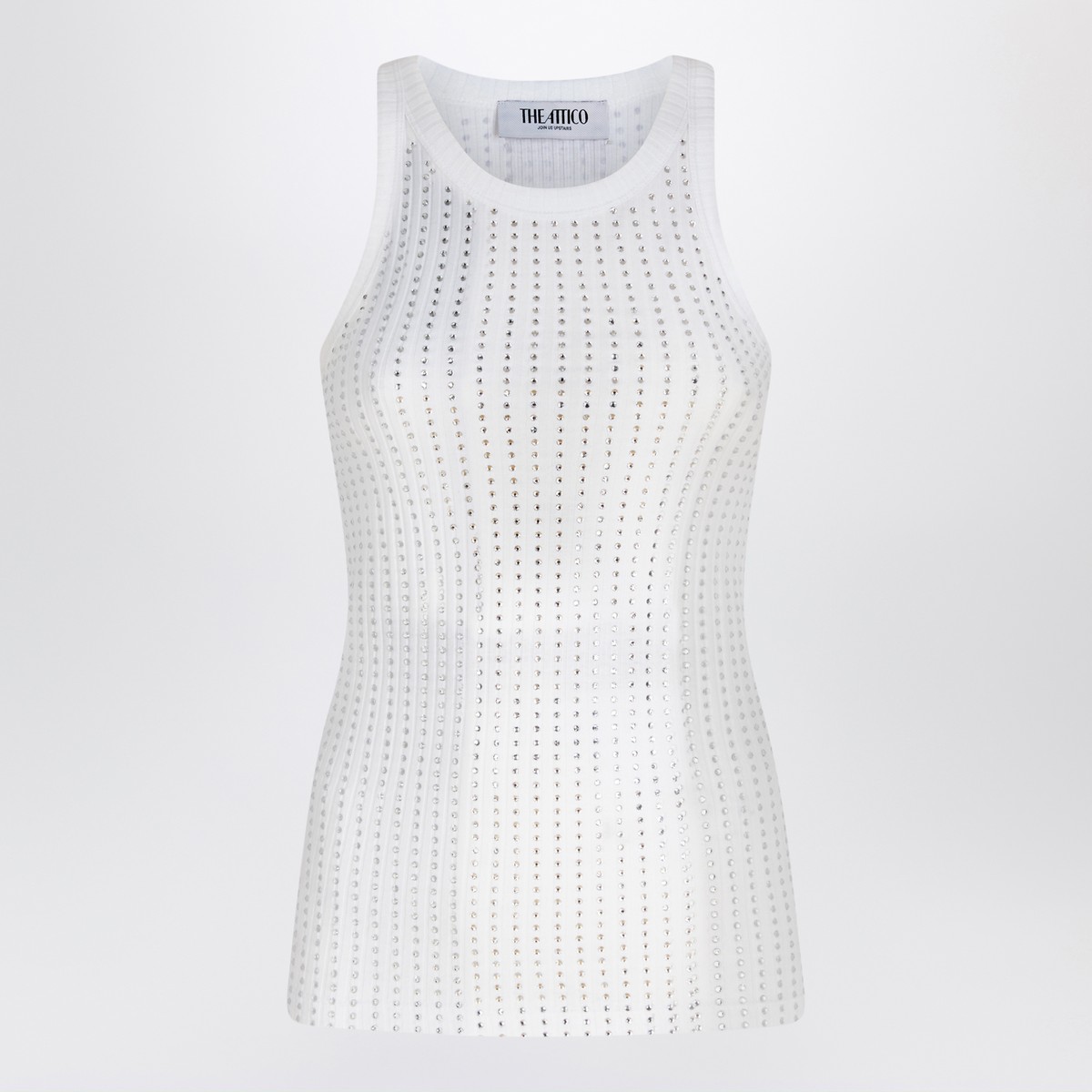 White cotton tank top by The Attico, featuring flat straps, ribbed design, all-over rhinestones, back logo patch, and regular fit.