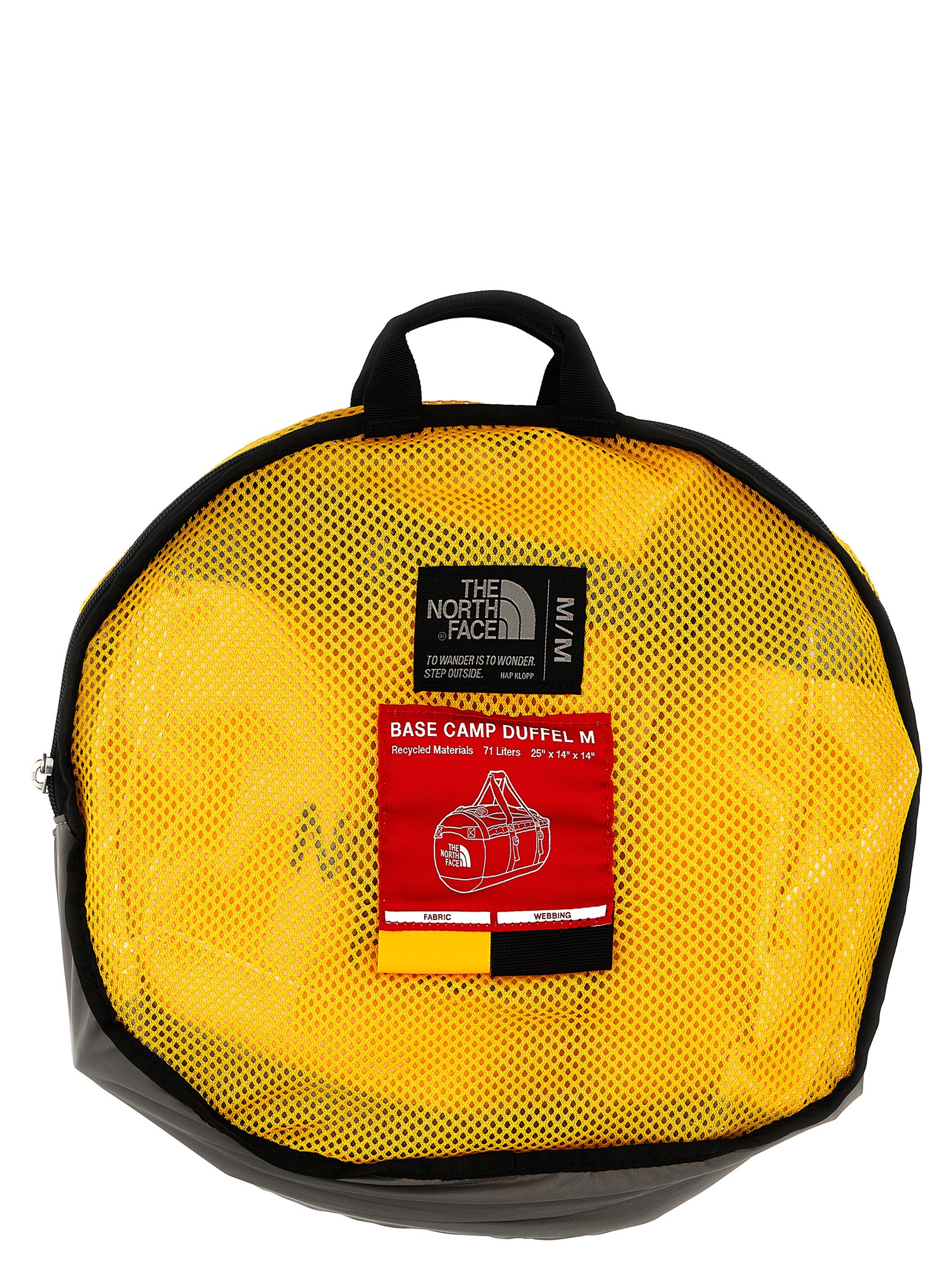 ‘Base Camp Duffel M’ duffel bag in water-resistant Base Camp technical fabric, zip closure, adjustable and removable shoulder straps, two padded side handles, D-opening with zip and flap, main compartment with mesh pocket closed by zip and pocket on the end, four compression straps, transparent document pocket on the top. Mesh bag to carry or store your duffel bag._x000D_