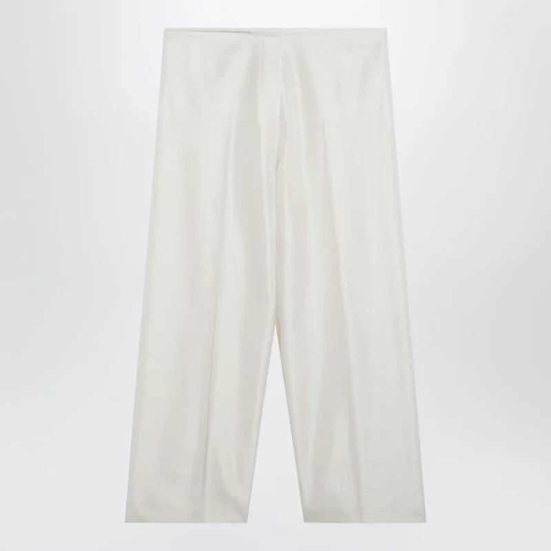 Beta silk trousers by The Row in shantung silk Color VANILLA Low rise pyjama inspired design Straight leg Pressed creases on front and back Elasticated waistband. Size and Fit – Model wears size 4 US Model measurements: Height: 182 cm Chest: 79 cm Waist: 62 cm Hips: 90 cm