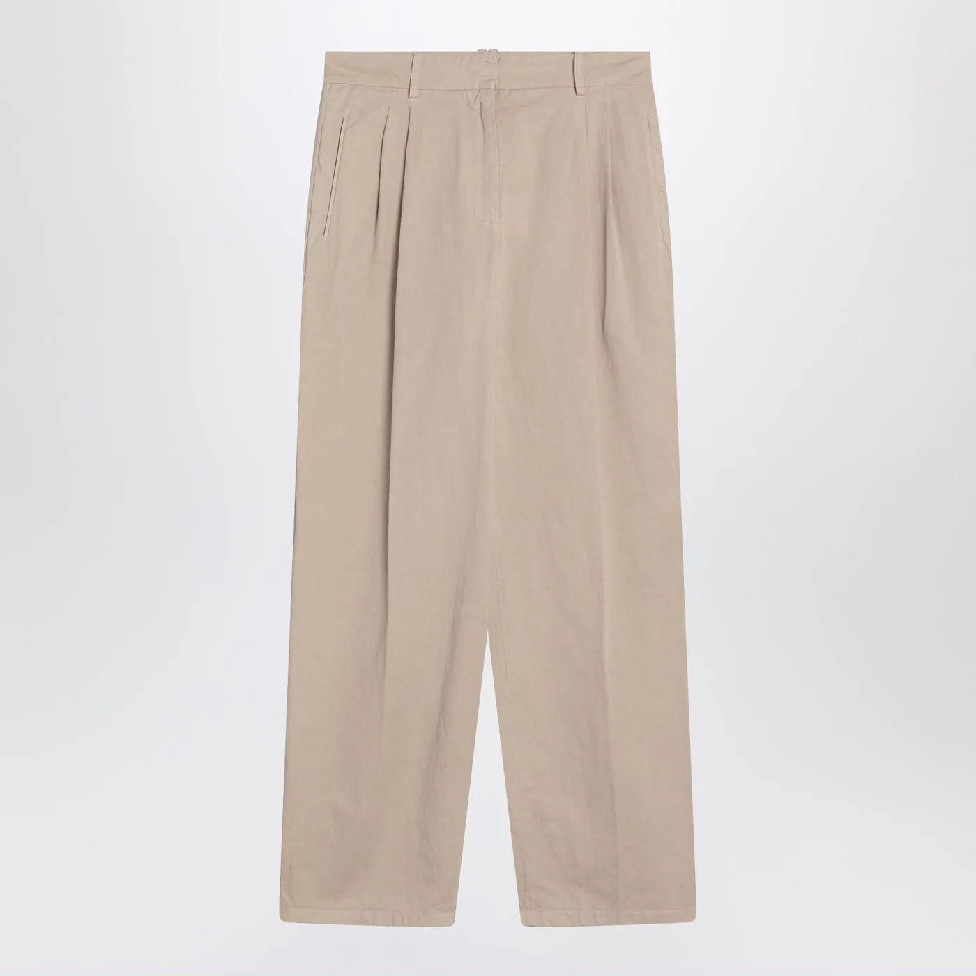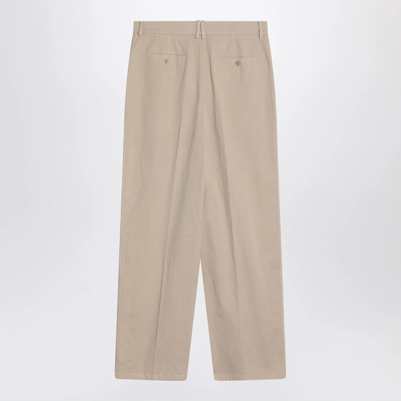 Light khaki cotton and linen trousers by The Row featuring a front zip closure with hook high waist with belt loops two side welt pockets two back welt pockets with button wide straight leg and pleats at the front.