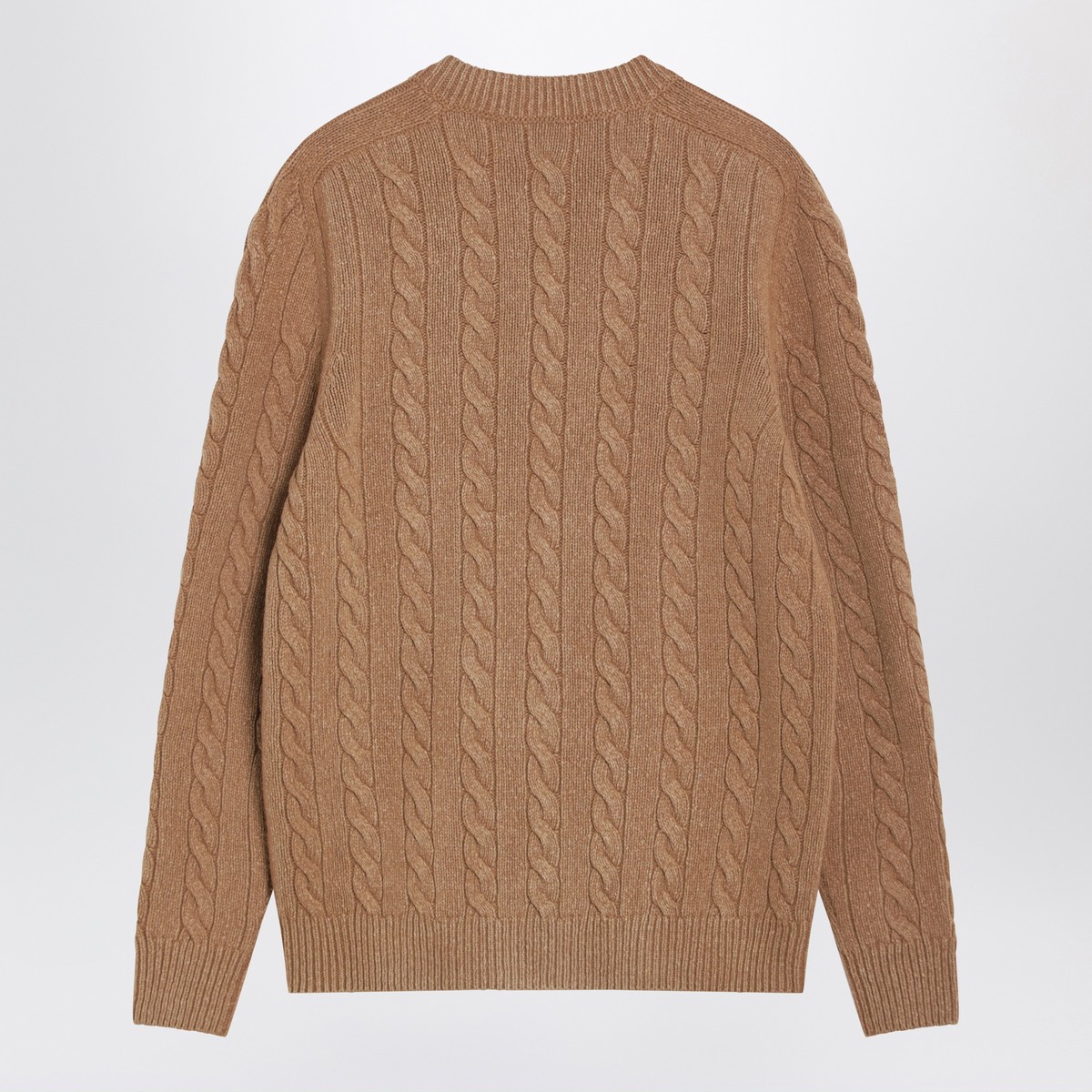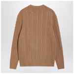 The Row crew-neck cardigan in light brown virgin wool, featuring front button fastening, long sleeves, cable-knit design, and ribbed trims.