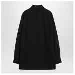 Black linen denim shirt by The Row, featuring a front button closure, long sleeves with buttoned cuffs, a classic collar, and a patch pocket on the chest.