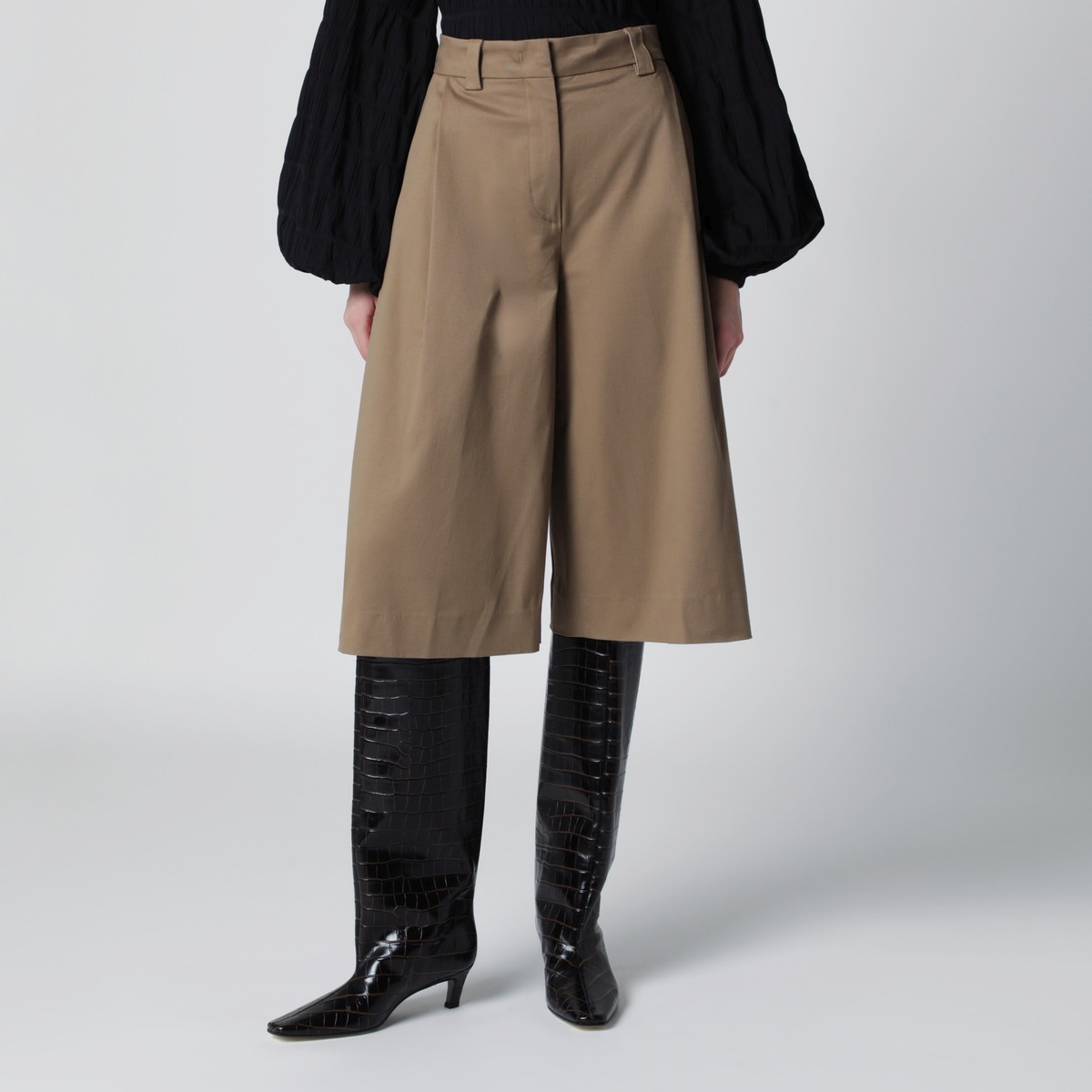 Cognac cotton bermuda shorts by The Latest, featuring belt loops, zip and hook fastening, front pleats, side and rear welt pockets.