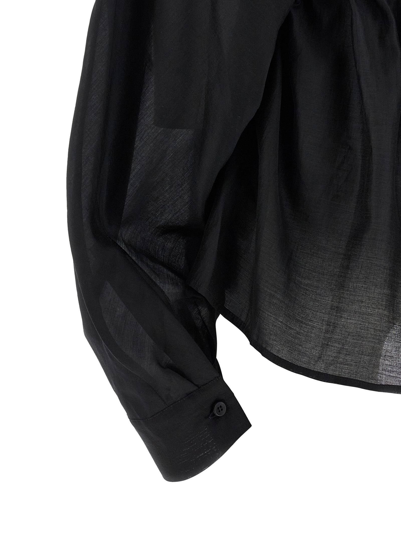 ‘dalida’ light muslin shirt with front mother-of-pearl button closure, Drawstring at the waist, Long wide sleeves with cuffs and dropped shoulders, Asymmetrical hem. Size and Fit – True to size fit