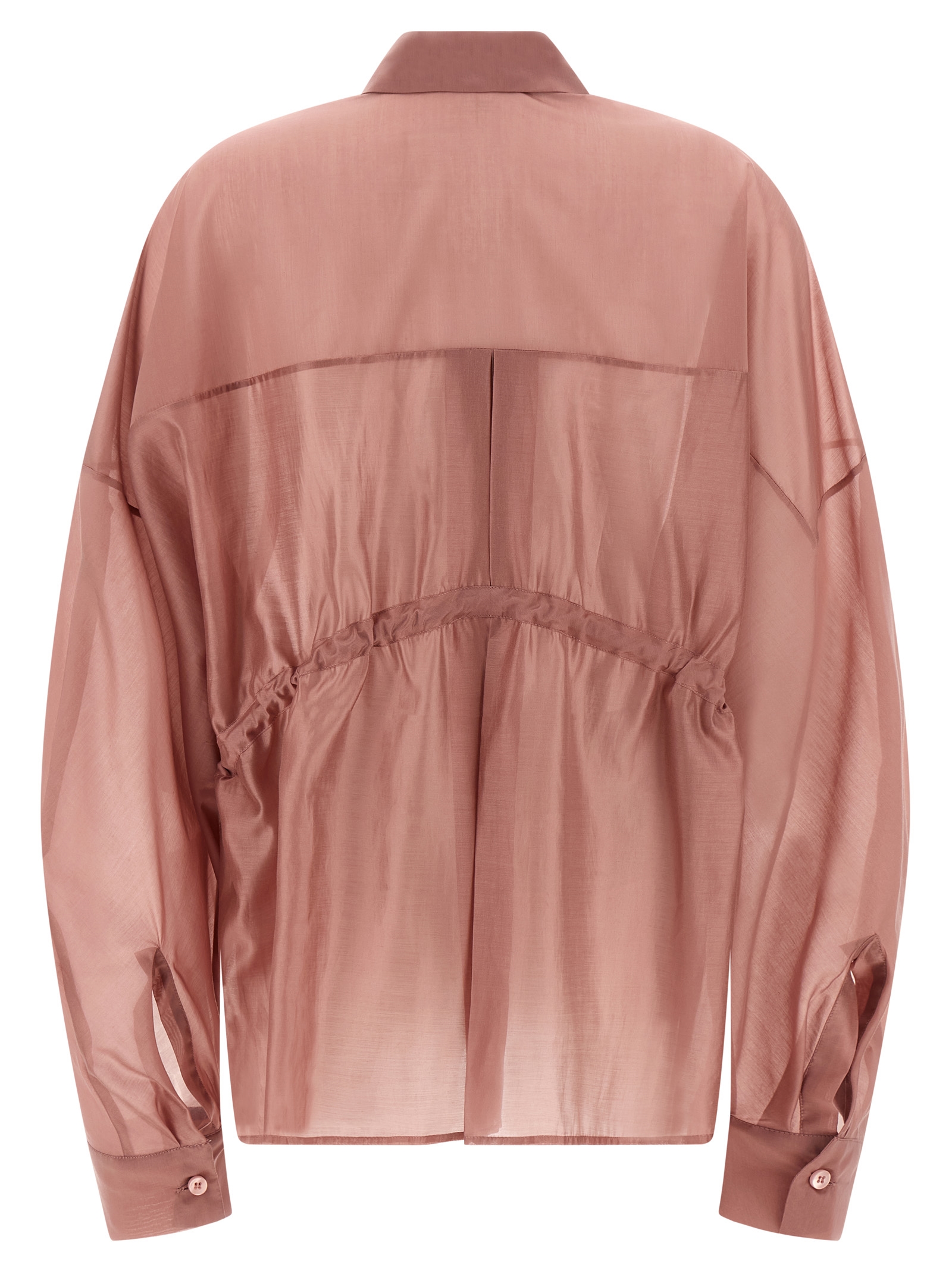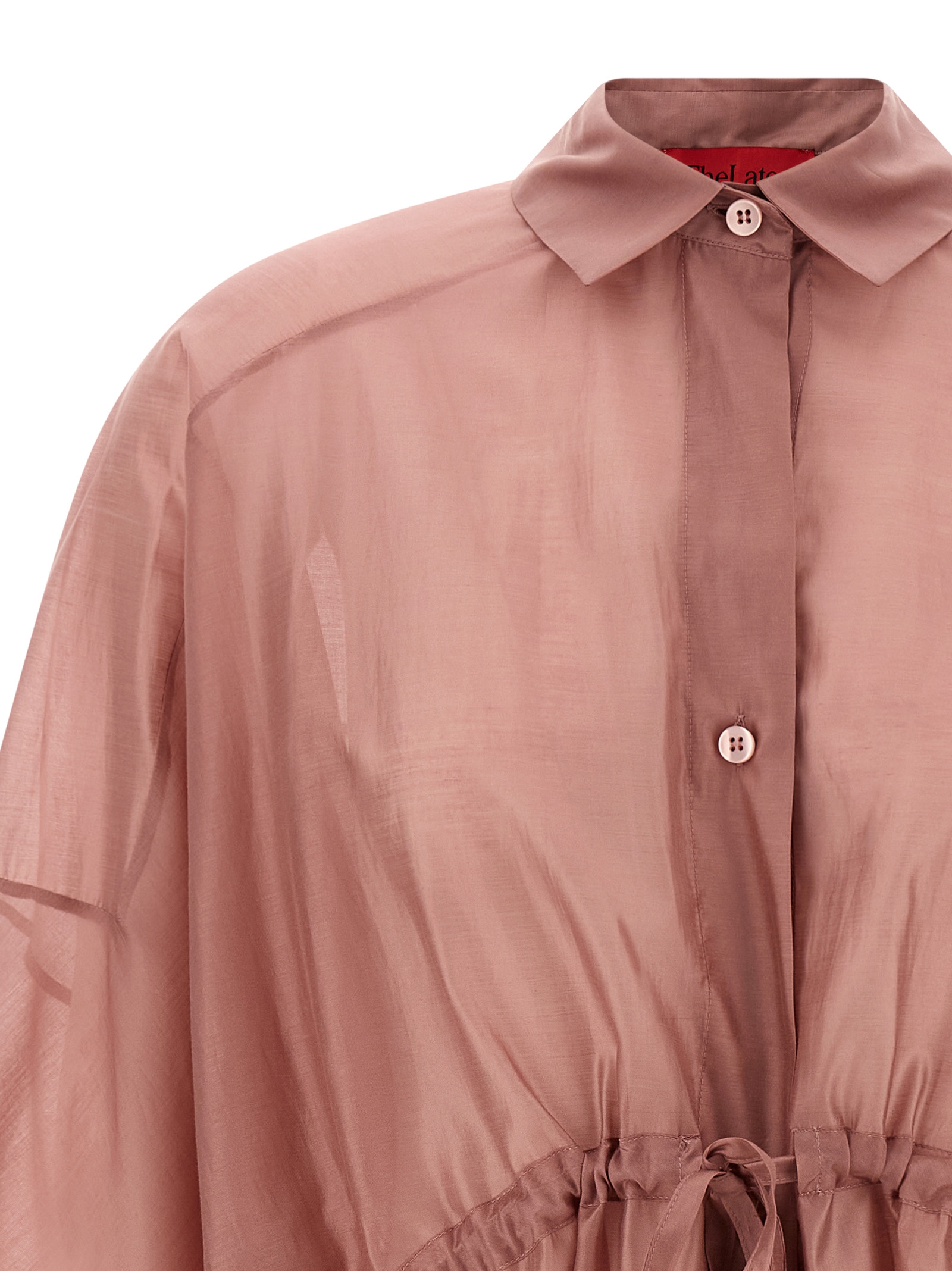 ‘dalida’ light muslin shirt with front mother-of-pearl button closure, Drawstring at the waist, Long wide sleeves with cuffs and dropped shoulders, Asymmetrical hem.