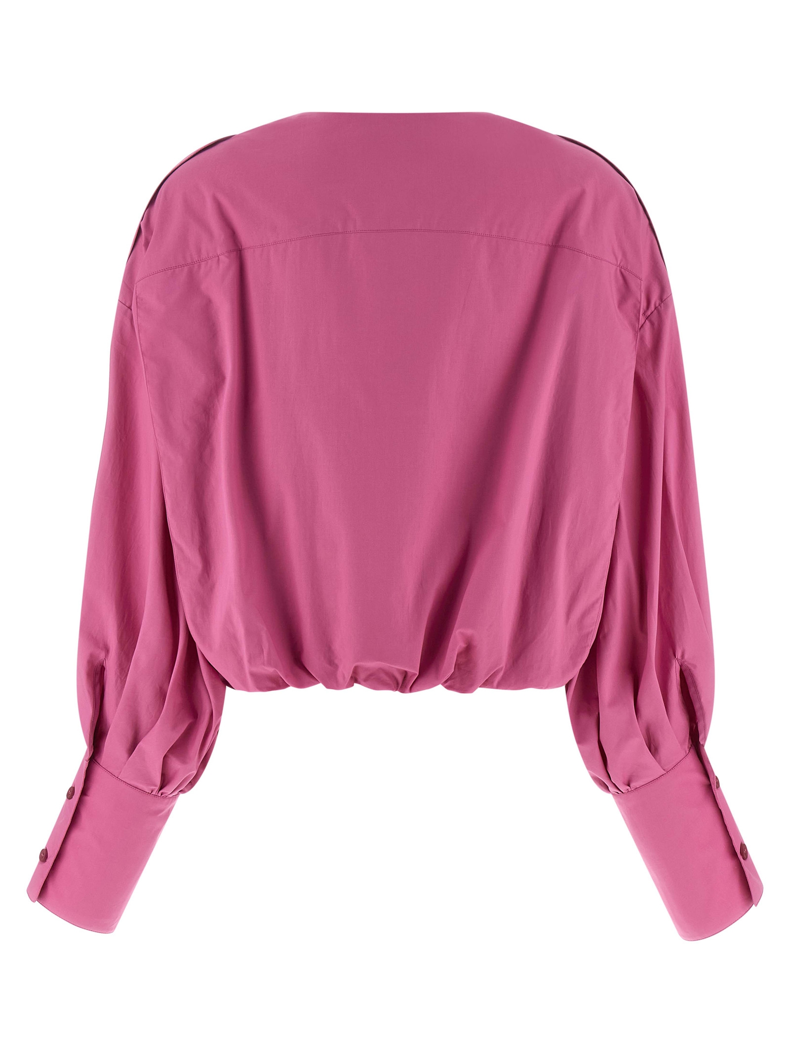 ‘diana’ blouse in cotton poplin with crew neck, Concealed front button closure, Wide puff sleeves with cuffs and dropped shoulder, Shoulder trim, And curling on the hem. Size and Fit – Boxy oversized fit