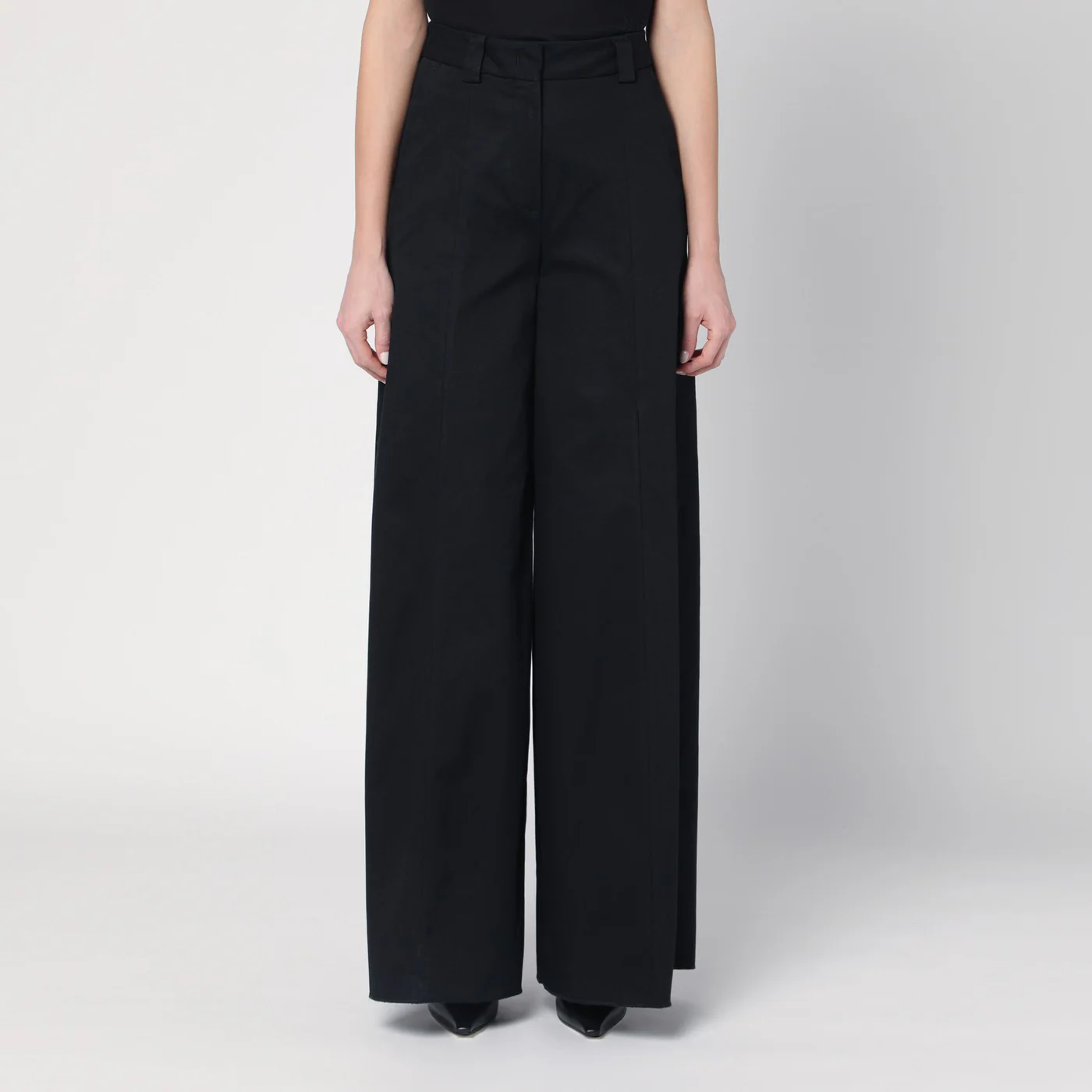 Wide pants by The Latest in black cotton characterized by a front zip closure and hook high waist with belt loops two side welt pockets and two back welt pockets. Size and Fit – Model wears size 40 IT Model measurements: Height: 179 cm Chest: 82 cm Waist: 65 cm Hips: 90 cm