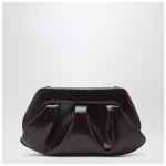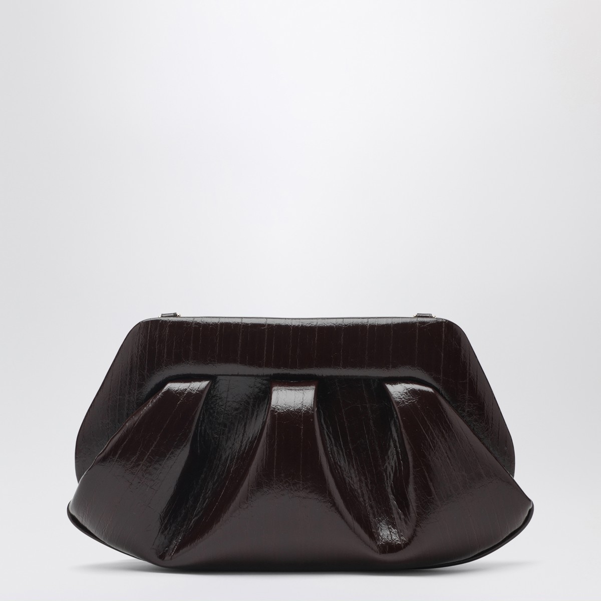 THEMOIRÈ clutch in chocolate brown striped-effect eco leather, featuring double magnetic closure, removable shoulder strap, fabric lining, internal card slot pocket and gold-tone metal hardware.