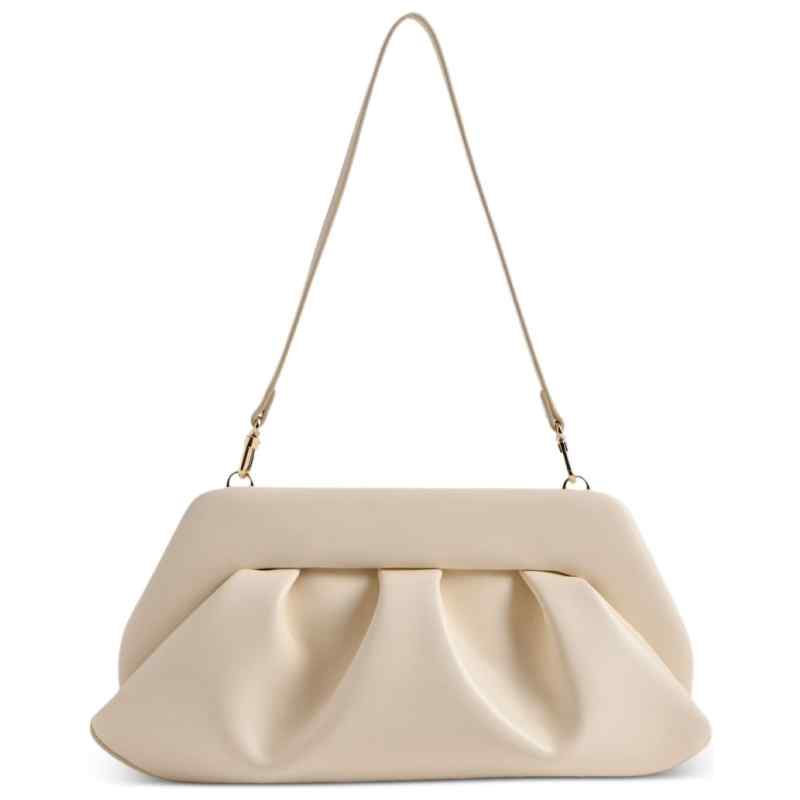 cream white ruched detail shoulder strap Bios Baguette vegan leather clutch. Size and Fit – WIDTH 34 cm. HEIGHT 15 cm.