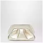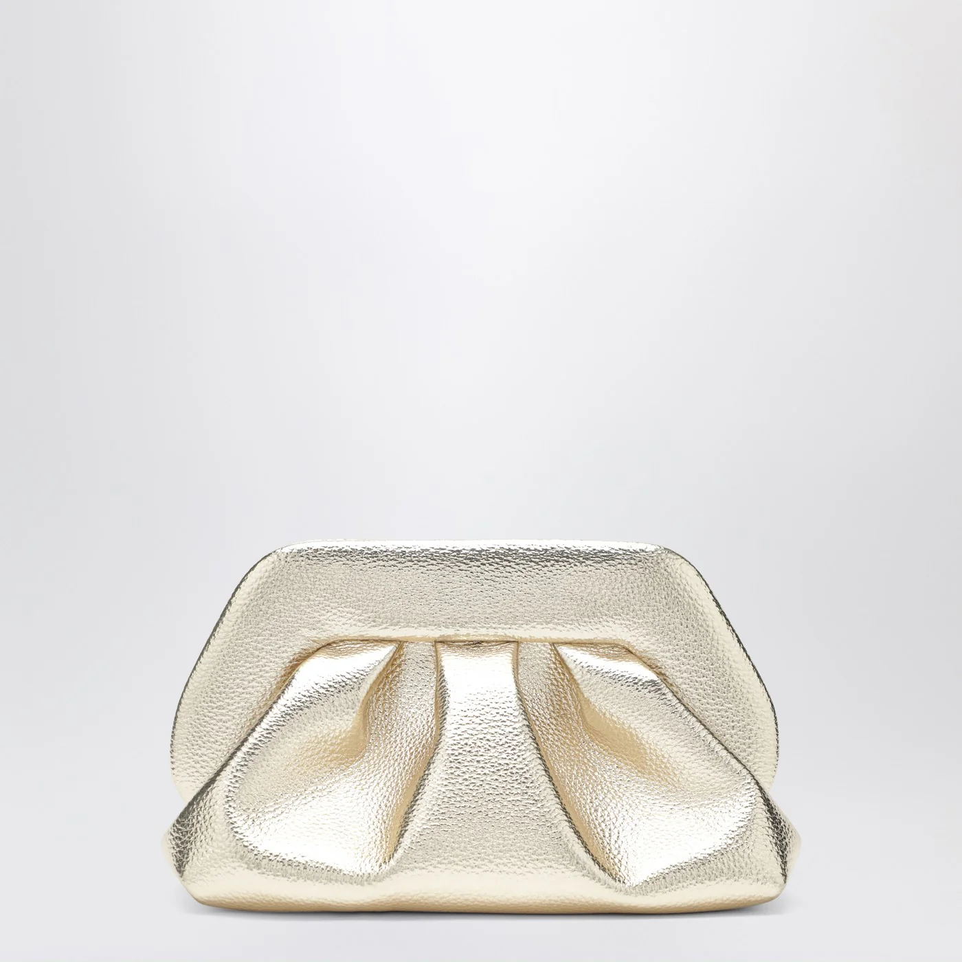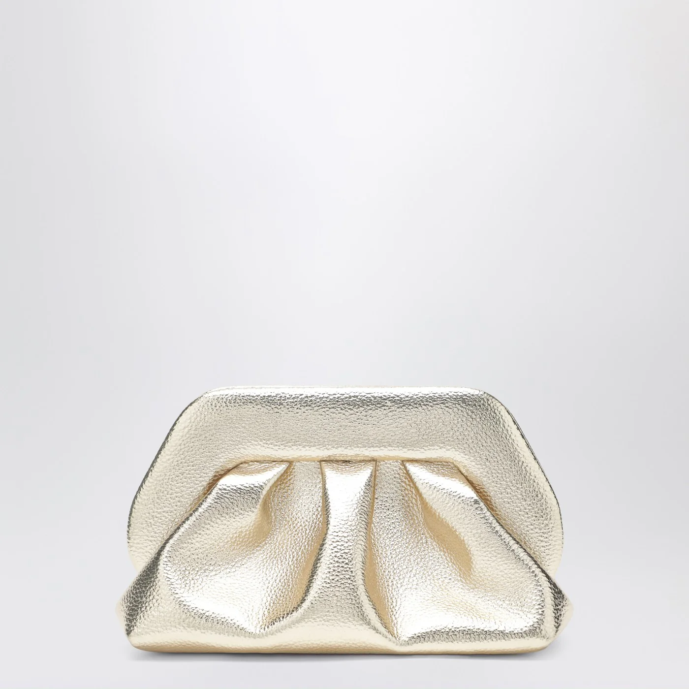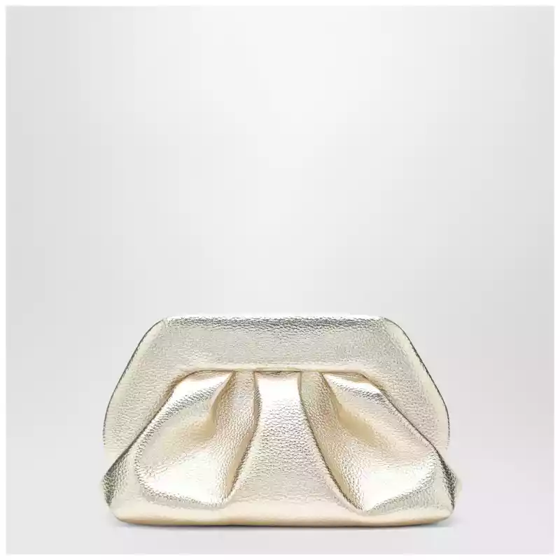 Clutch by THEMOIR in gold hammered effect eco leather Double magnetic closure Removable and adjustable shoulder strap Decorative ruching Fabric lining. Size and Fit – Width 27 cm x Height 17 cm x Depth 14 cm Adjustable shoulder strap length min 90 cm – max 105 cm