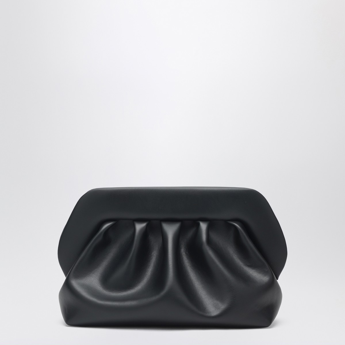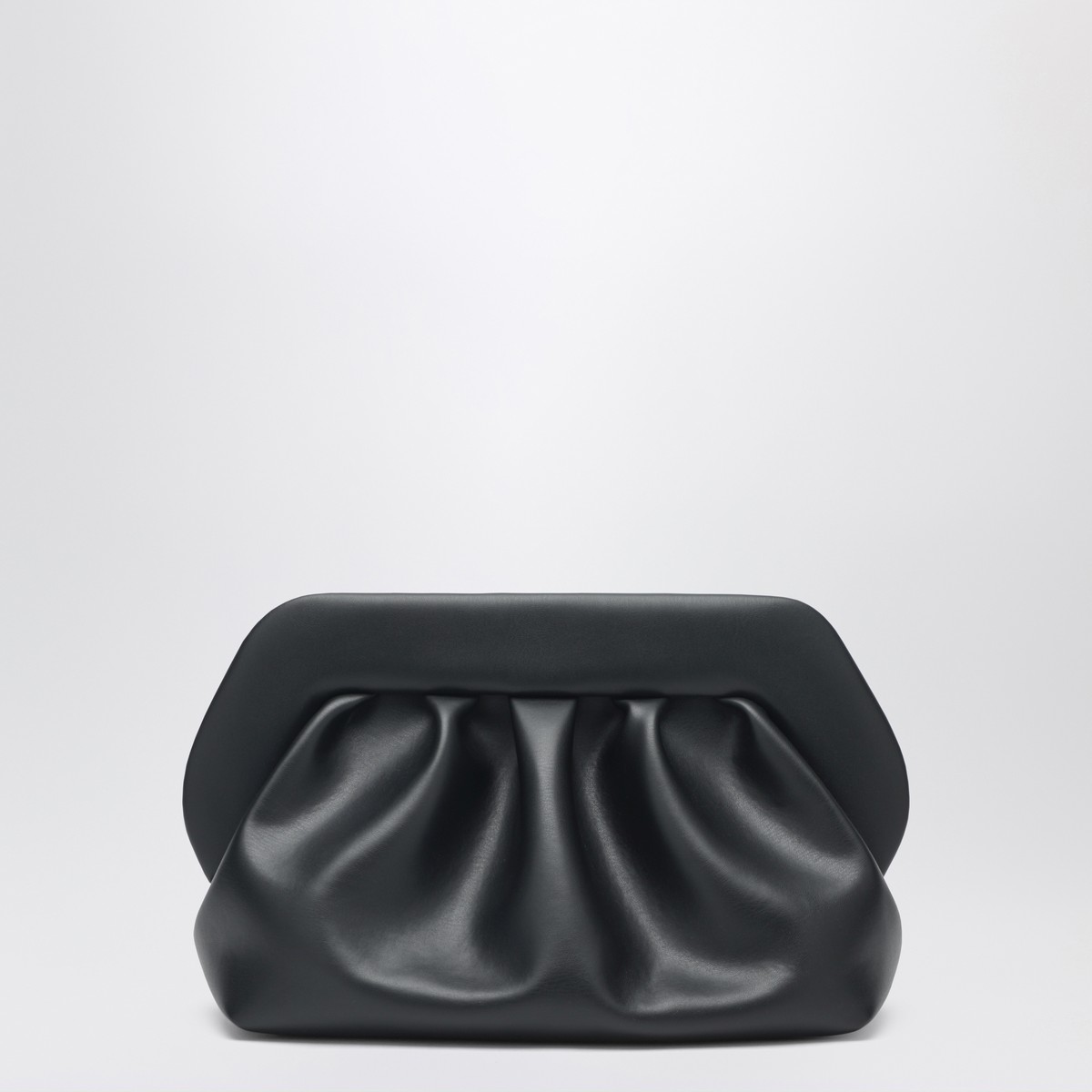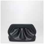 THEMOIRÈ large clutch in black eco leather, featuring double magnetic closure, removable and adjustable shoulder strap, decorative ruching and fabric lining.