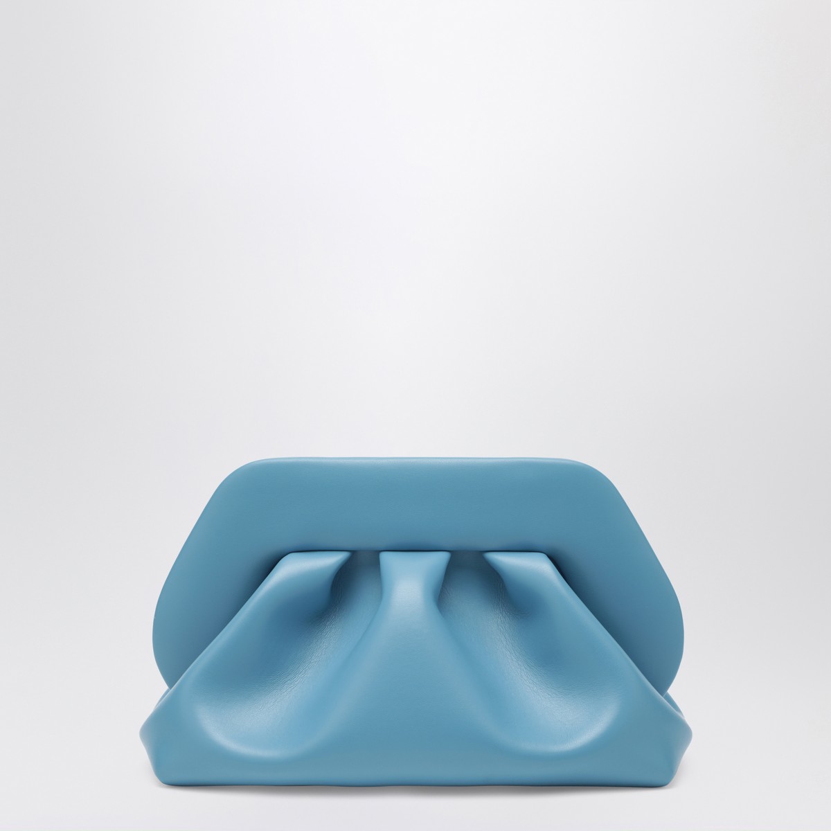THEMOIRÈ clutch in light blue eco leather, featuring double magnetic closure, removable and adjustable shoulder strap, decorative ruching and fabric lining.