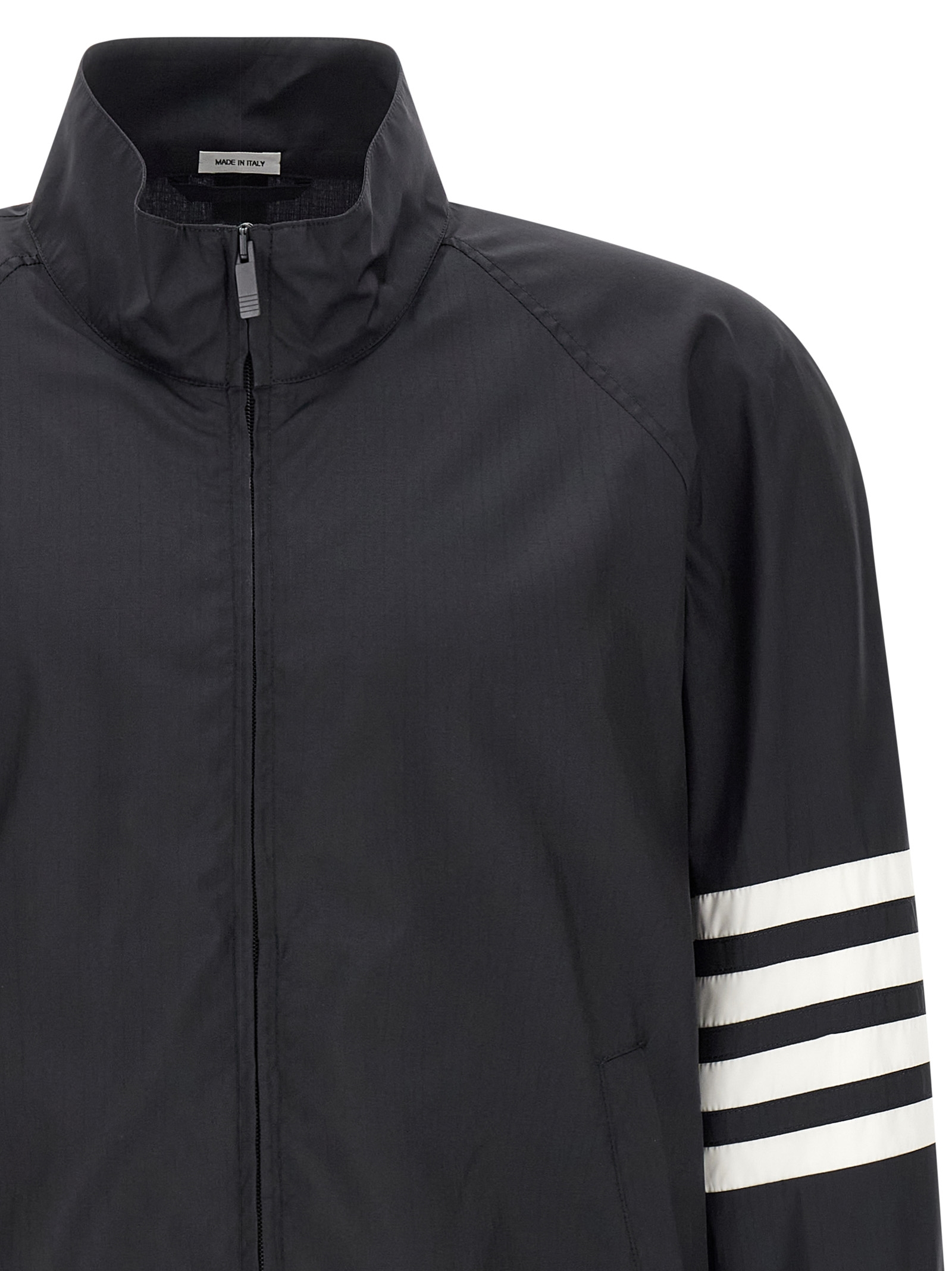 Shiny ripstop fabric jacket, Unlined, High neck, Front zip closure, Pockets, Long raglan sleeves with ‘4bar’ detail and elastic cuffs, Elastic on the hem.
