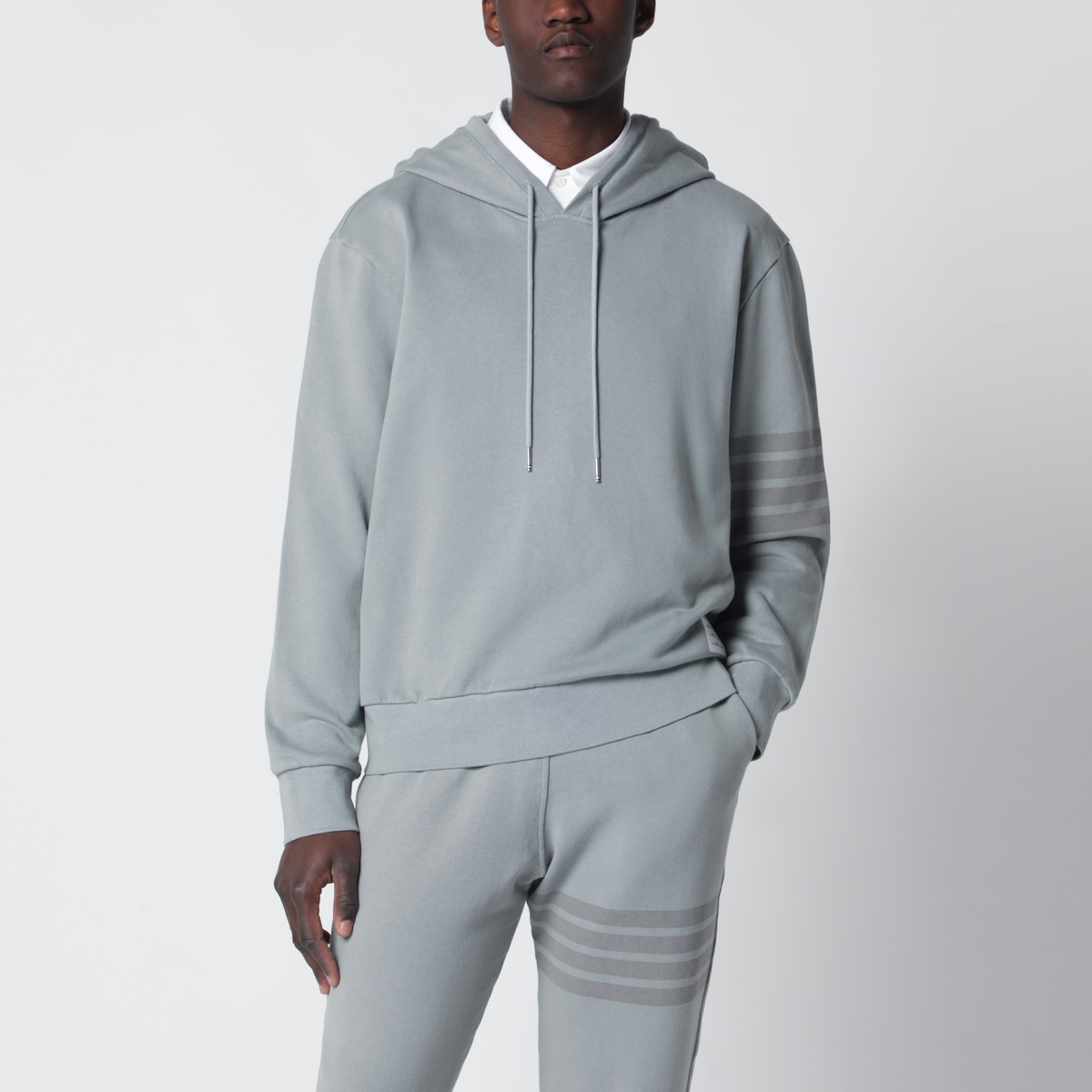 Thom Browne light grey cotton sweatshirt, featuring a drawstring hood, logo patch on the front, ribbed trims and long sleeves with a 4-Bar detail on one sleeve.