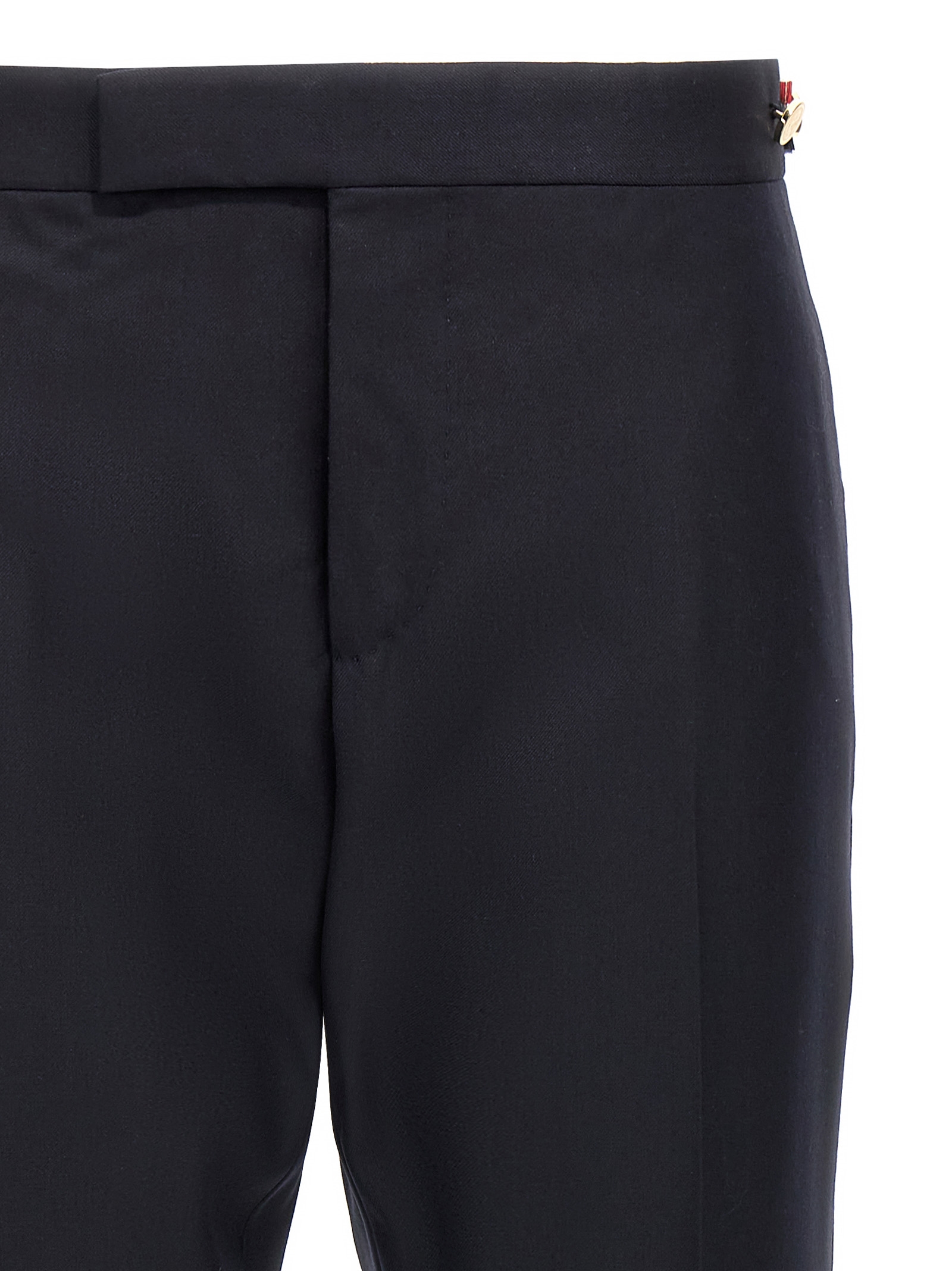 ‘Low rise’ wool twill pants, button and hook closure, side ‘4bar’ and button detail, side pockets, straight leg with central crease.