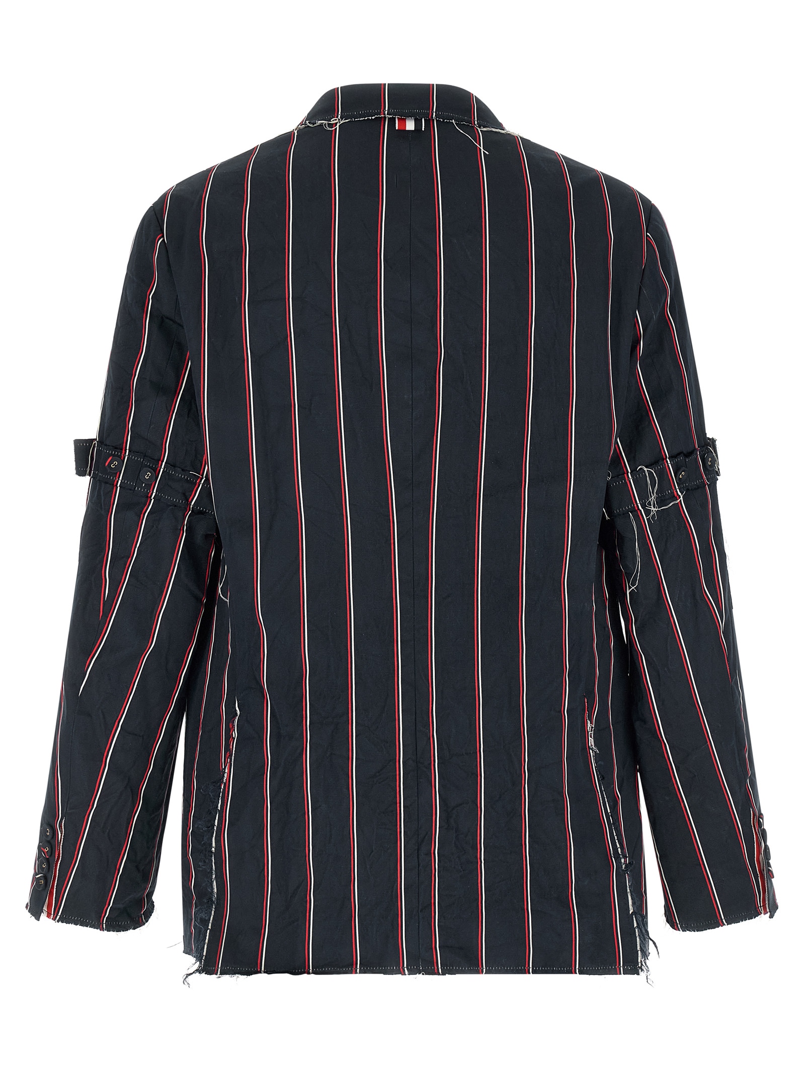 Mogador striped patterned silk and cotton blend blazer jacket with raw cut fringed hem, Deconstructed single-breasted model with front button closure, Breast pocket, Flap pockets, Cuffs with open buttonholes, Back slits, Striped oxford cotton lining.