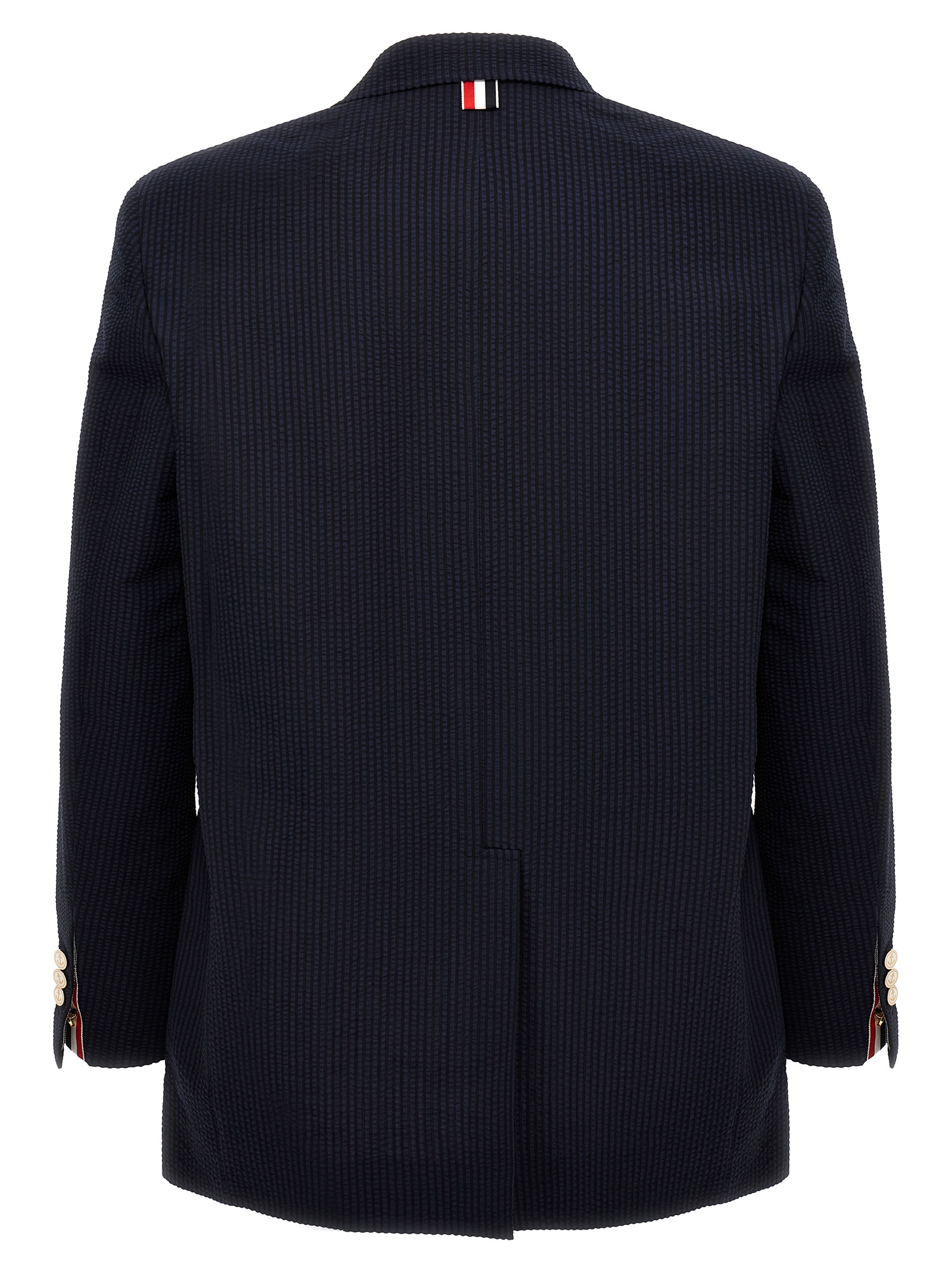 Single-breasted wool seersucker blazer with button closure, pockets, long sleeves, back slit.