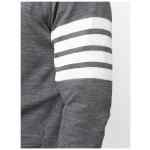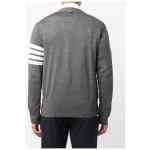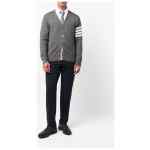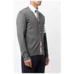 Grey merino 4-Bar knitted cardigan from THOM BROWNE featuring signature 4-Bar stripe, V-neck, front button fastening, long sleeves and buttoned cuffs. 4Bar wool cardigan