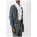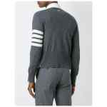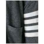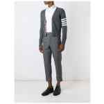 4-Bar cashmere cardigan from THOM BROWNE featuring medium grey, cashmere, knitted construction, ribbed trim, signature 4-Bar stripe, grosgrain ribbon trim, V-neck, two front patch pockets, long sleeves, front button fastening and straight hem. 4Bar cashmere cardigan