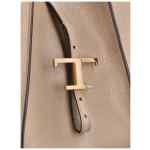 beige, grained texture, tonal topstitching, signature T buckle, detachable pouch, double top handle. Medium leather tote bag
