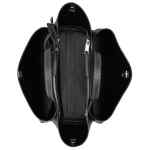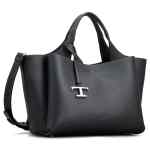 black, leather, grained texture, debossed logo to the front, logo pendant, decorative stitching, hook fastening, adjustable detachable shoulder strap, two top handles, partitioned compartment, internal zip-fastening pockets, metal feet. Mini leather tote bag