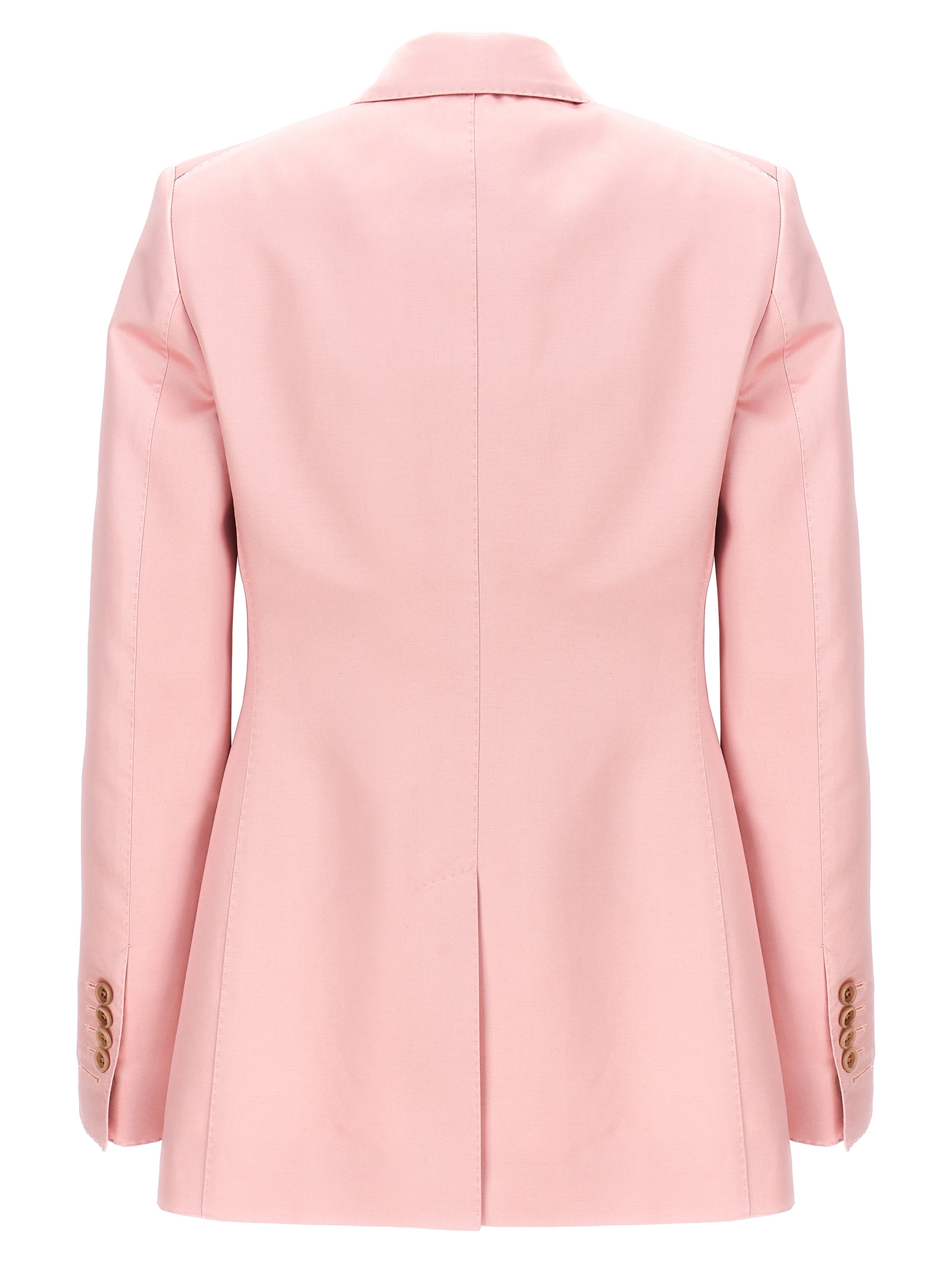 Double-breasted duchesse blazer with button closure, pockets, long sleeves, pockets, structured shoulder straps, back vent.