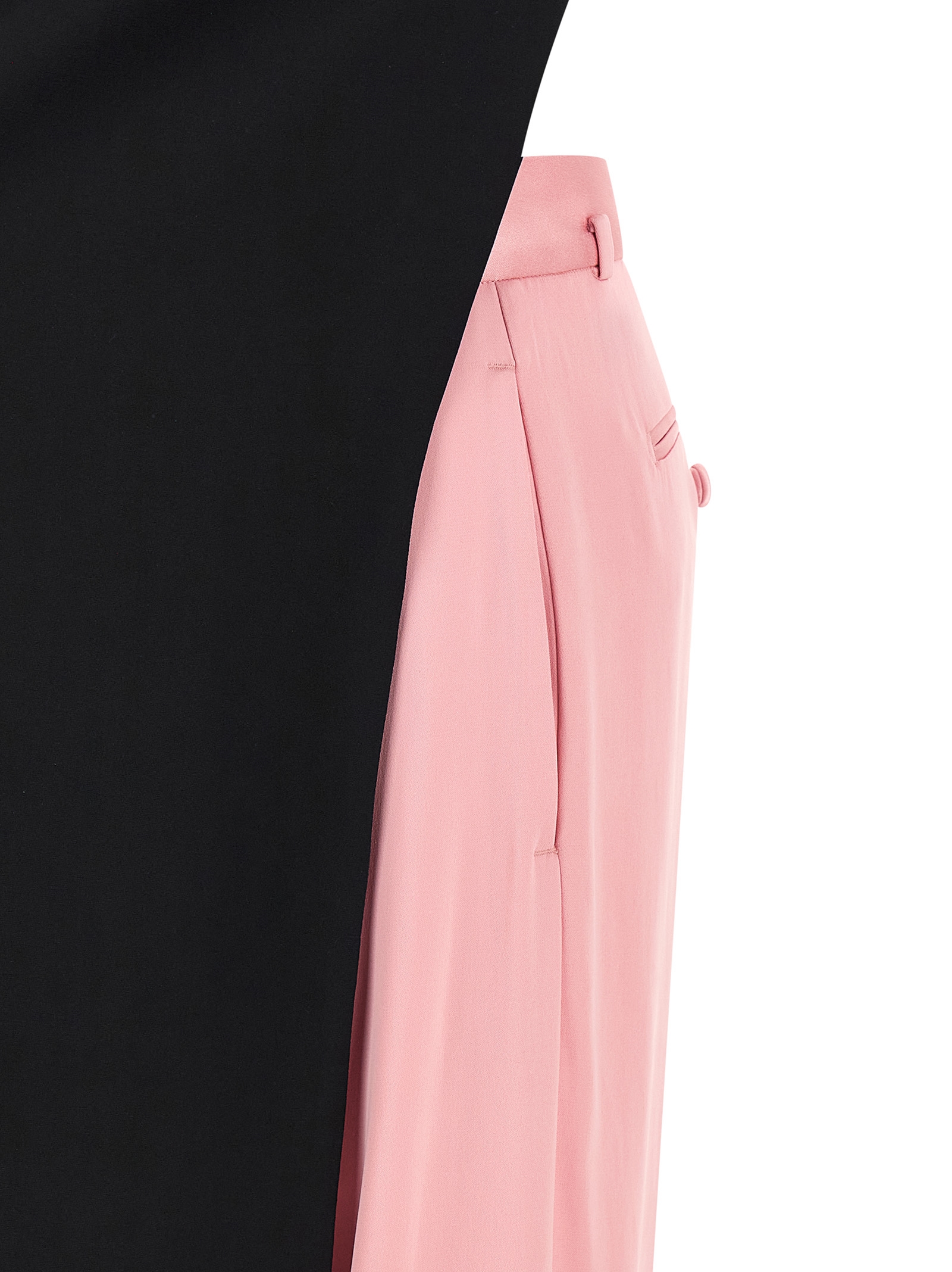 Double georgette stretch jumpsuit consisting of tunic resting on the shoulders, Long to the feet and stitched on the right leg of the trousers, Crew neck, Back zip closure, Completely exposed back and contrast trousers, Wide and straight leg, Stretched pleat, Zip hook and front button closure, Front french pockets, Back welt pockets. Size and Fit – true to size fit – FRENCH size