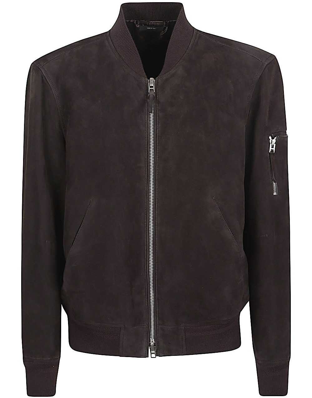Leather jacket with zip closure, brown, front pockets, cuffs. Suede leather bomber jacket