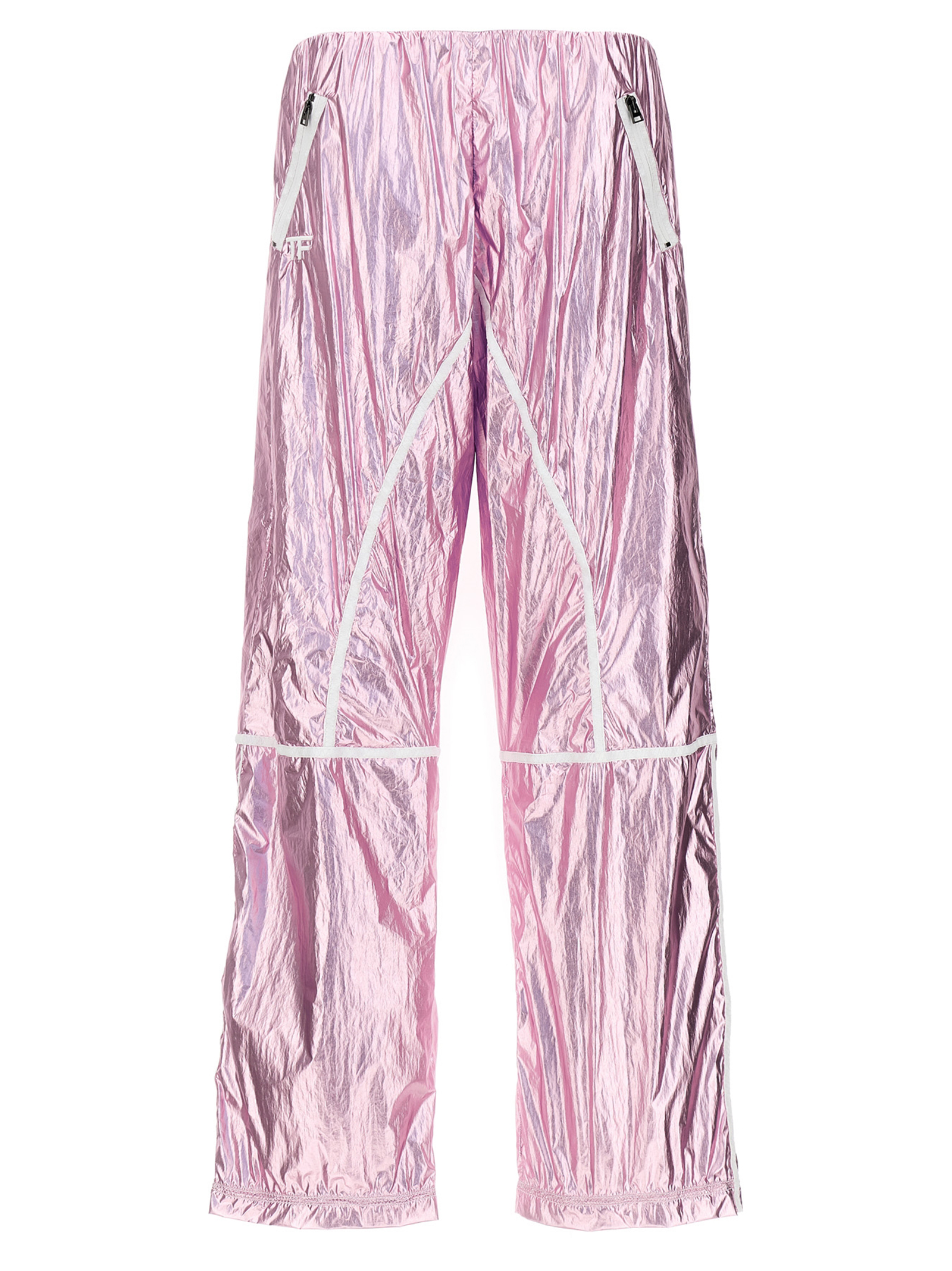 Laminated fabric track pants with elastic waistband, front logo embroidery, pockets.