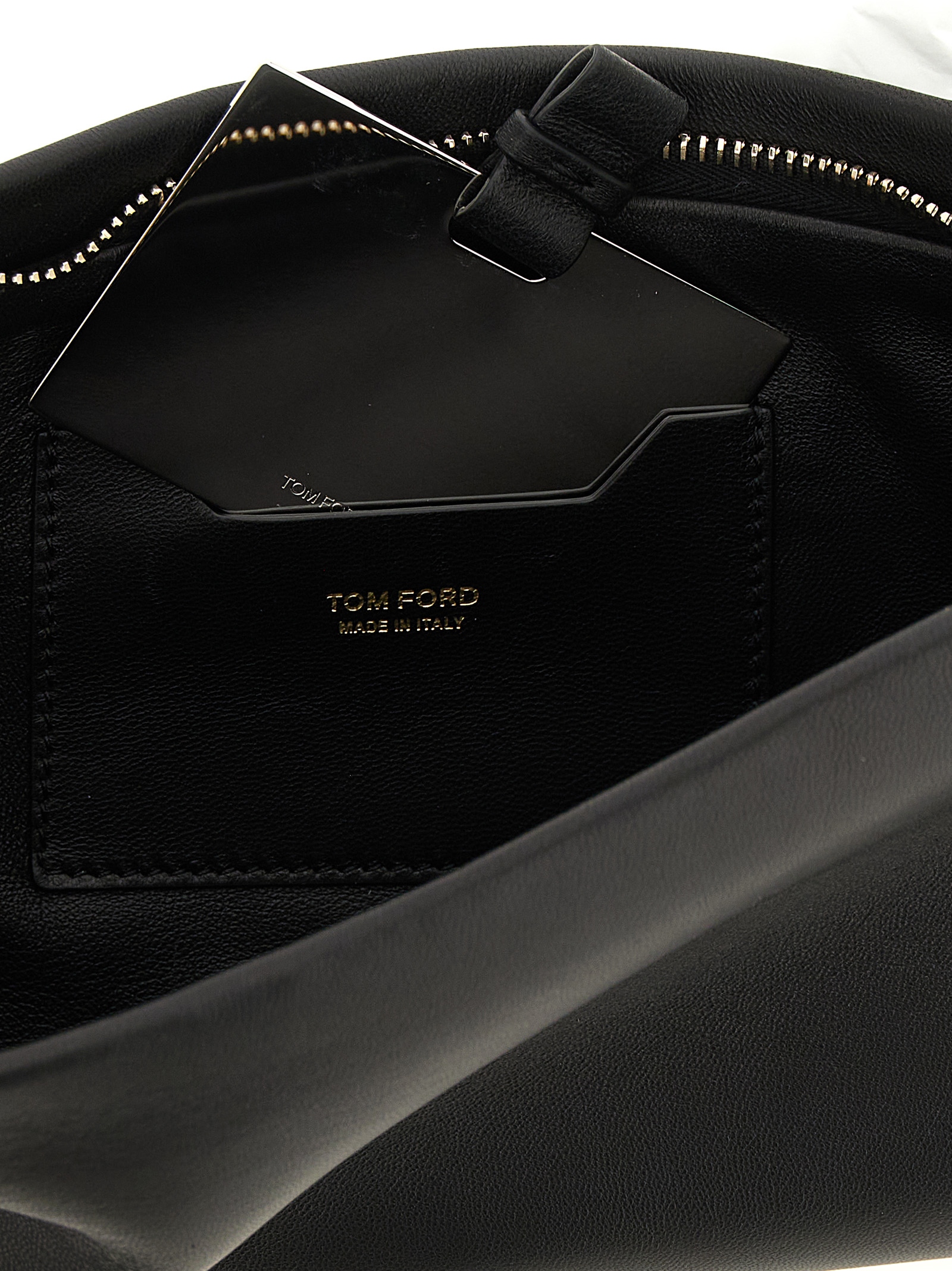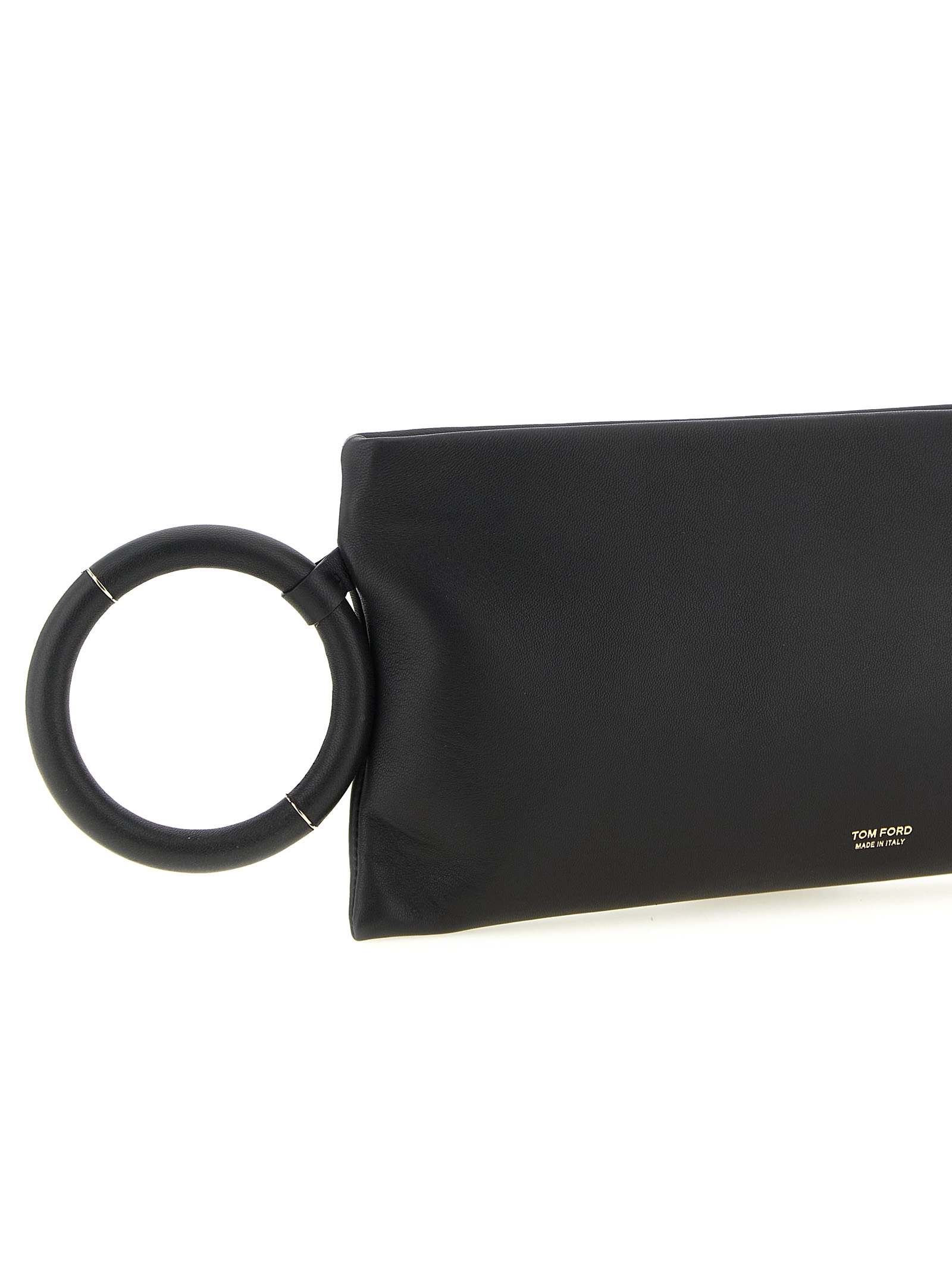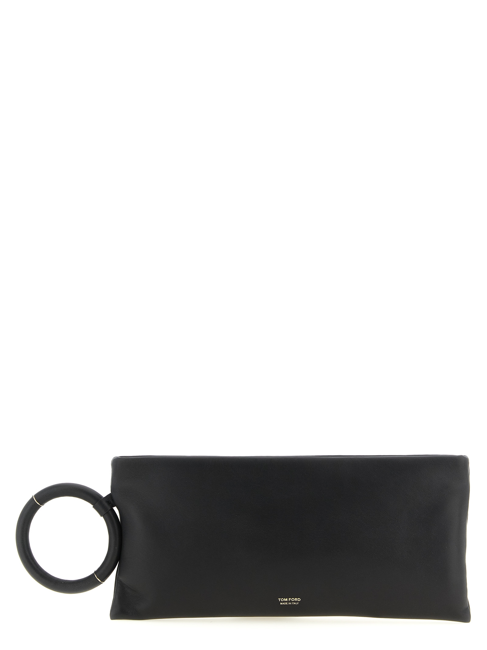 Nappa clutch, zip closure, leather side detail with gold trim, front logo.