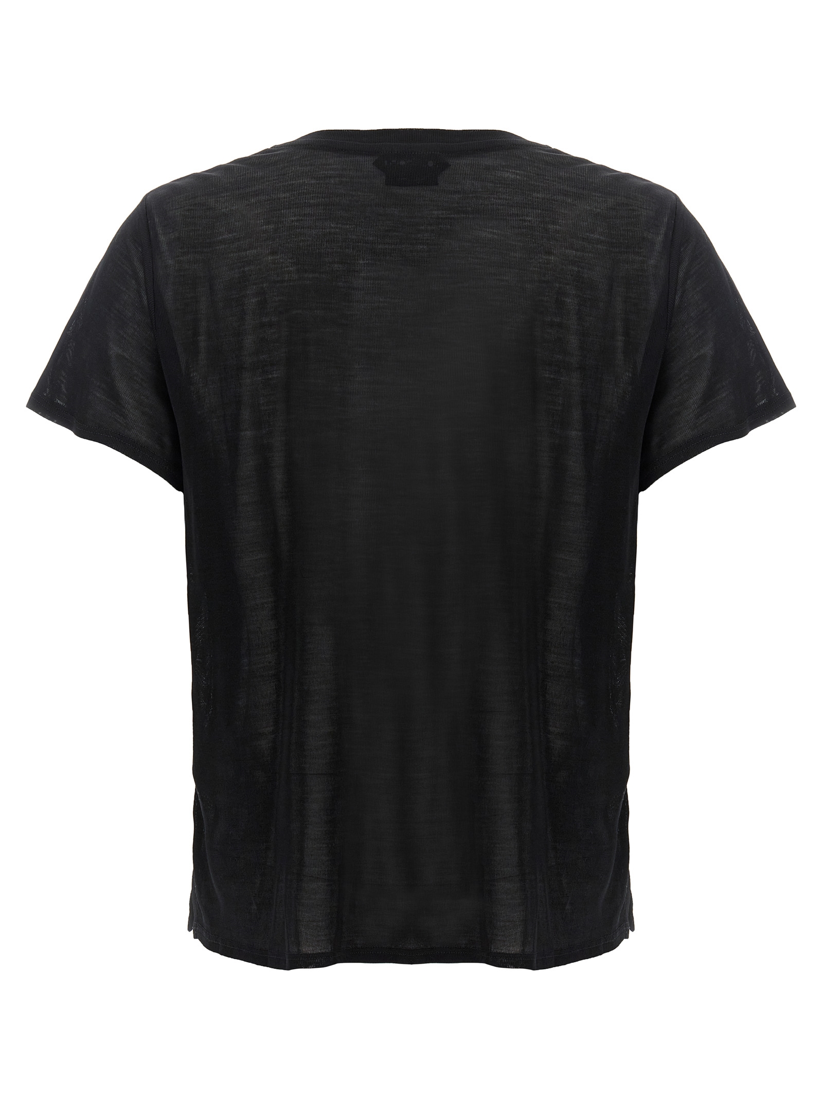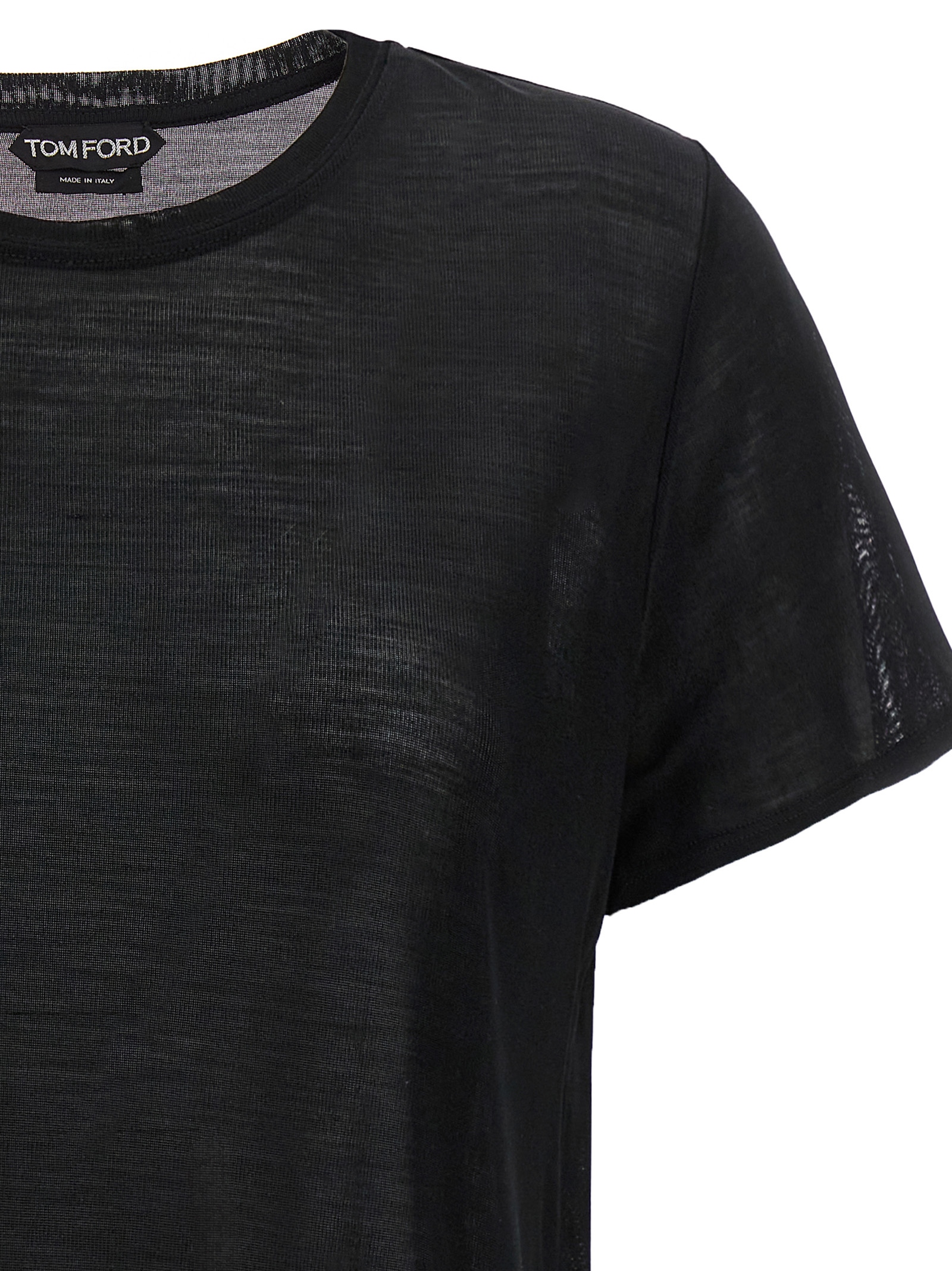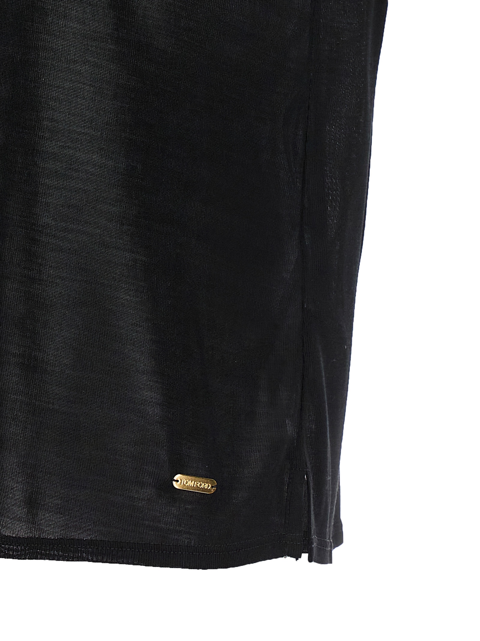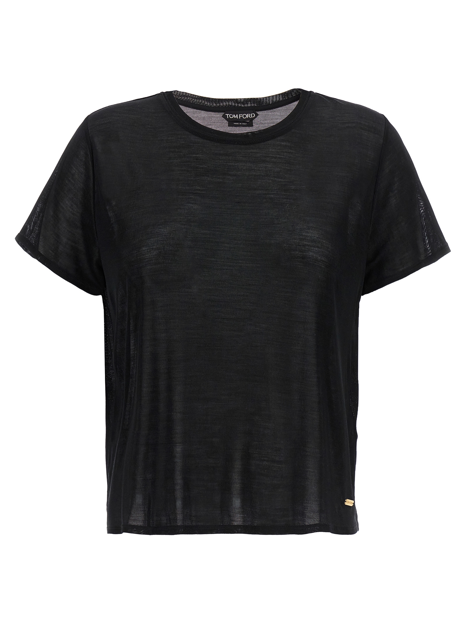 T-shirt in silk, crew neck, short sleeves, gold metal logo plaque.