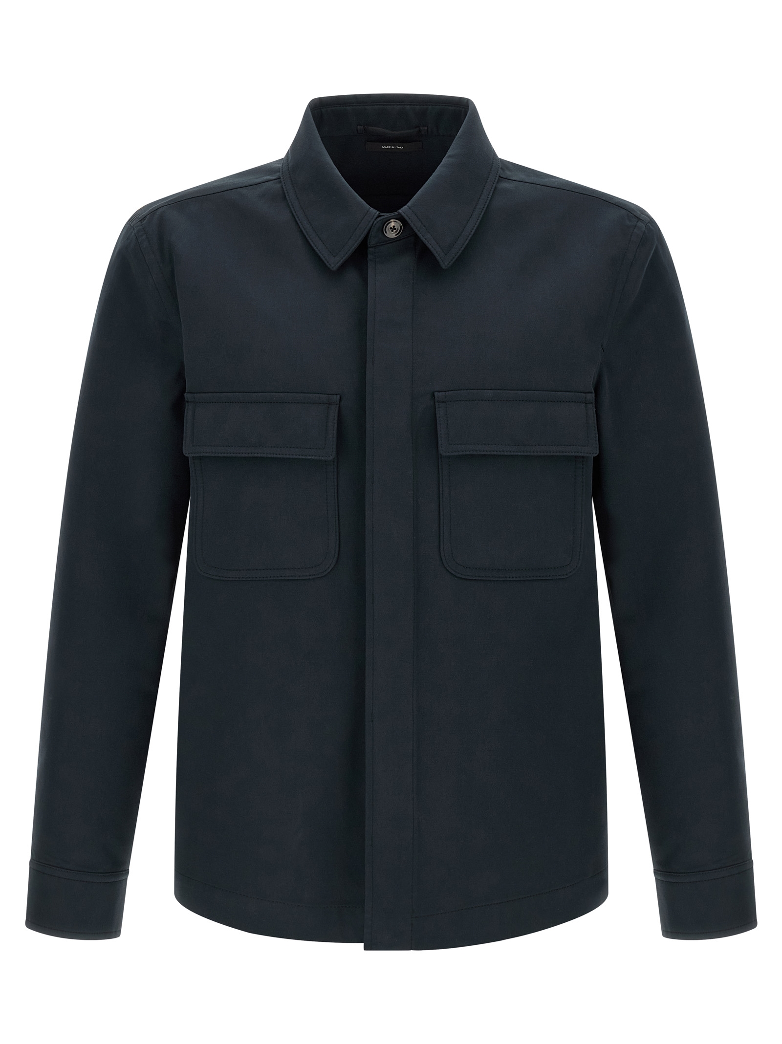 Heavy cotton twill overshirt, front concealed button closure, pockets, long cuffed sleeves, side slits.