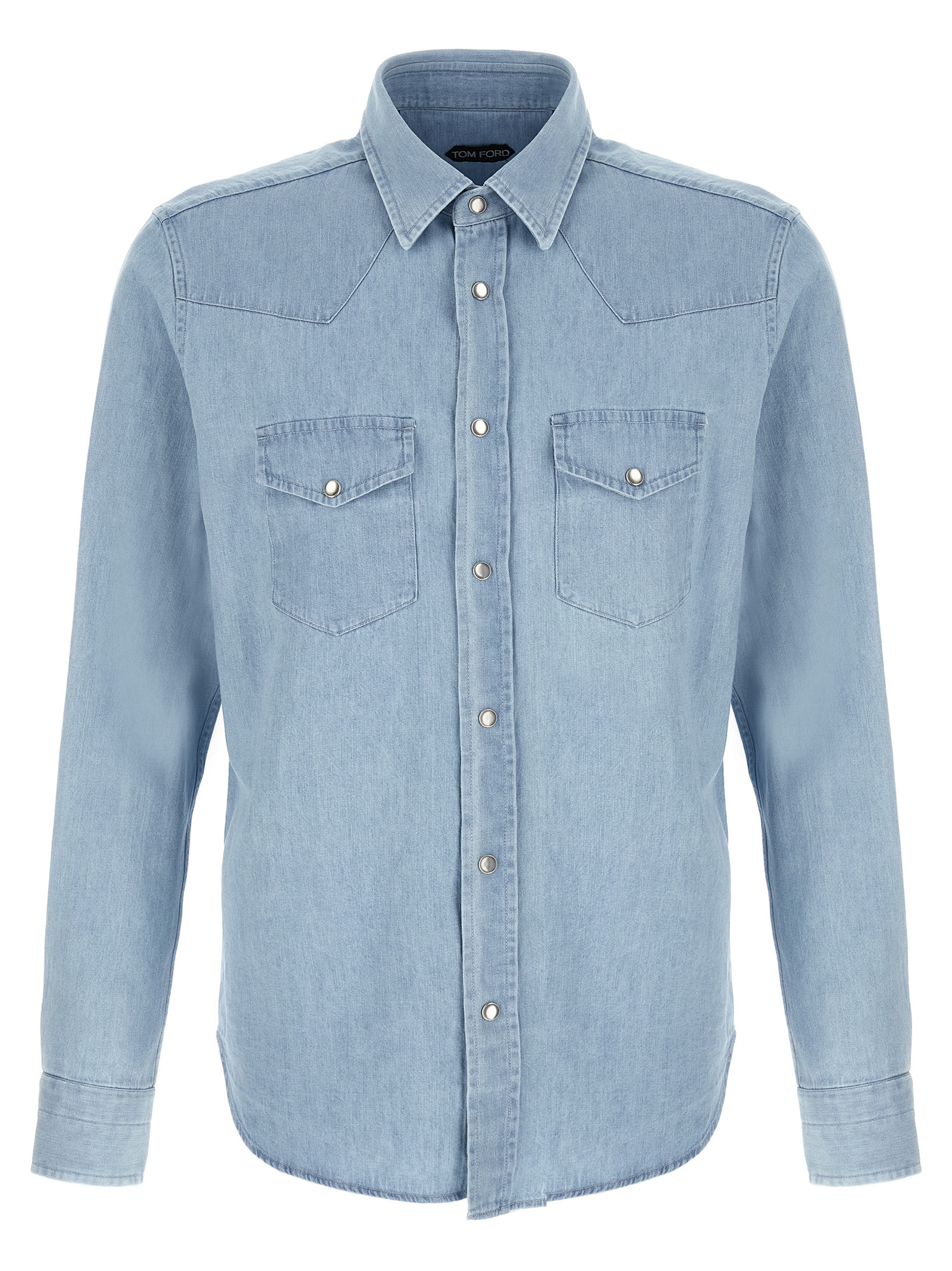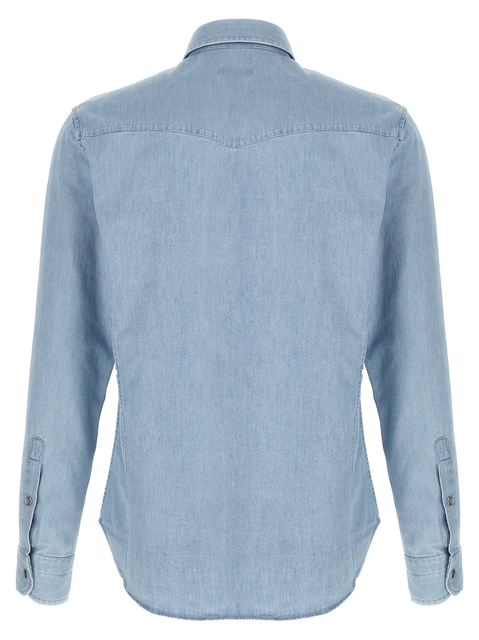 ‘Western’ Chambray denim shirt with front snap button closure, pockets, long cuffed sleeves.