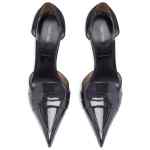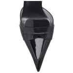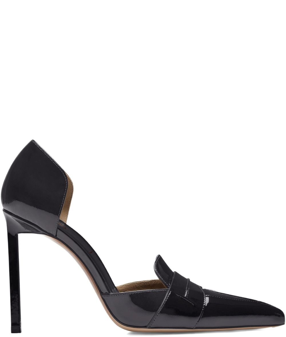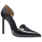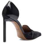 black pointy toe shape stiletto heel tone-on-tone T detail on vamp Patent leather pumps