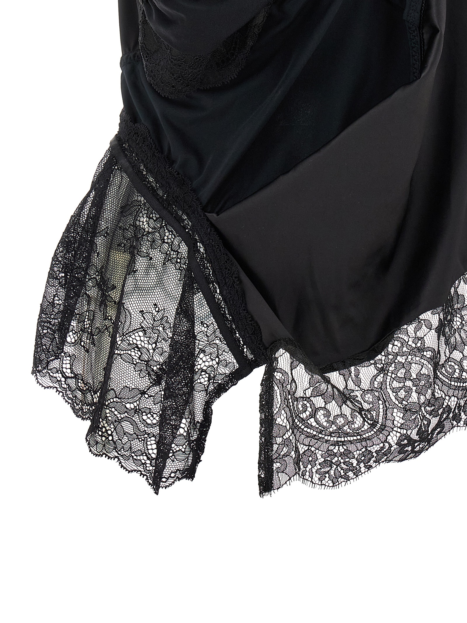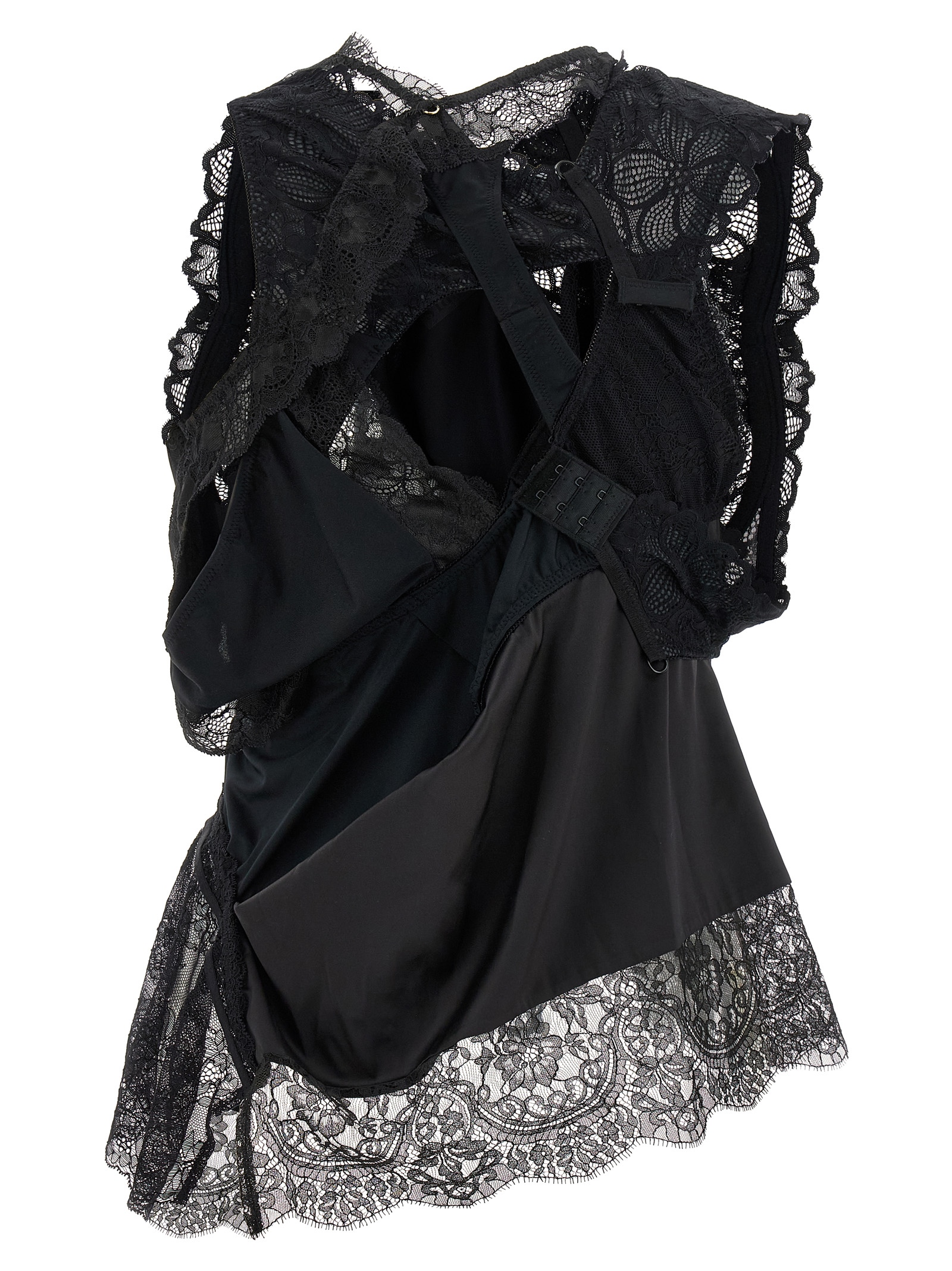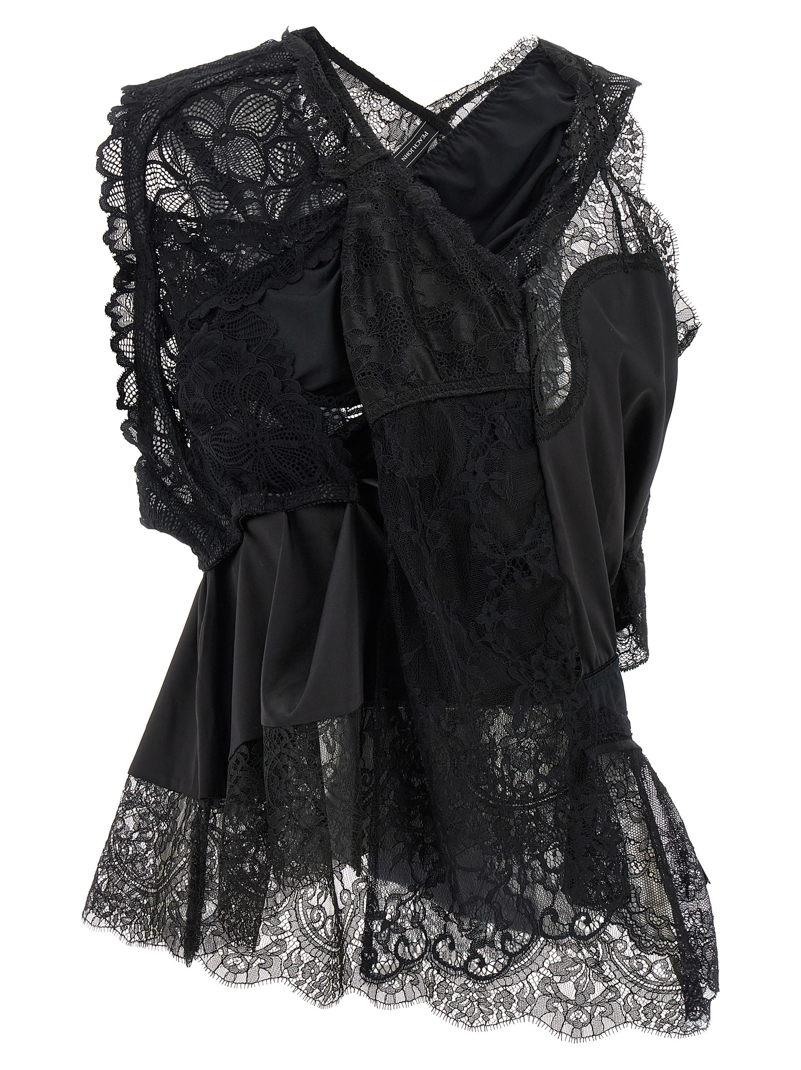 Junya watanabe x peach john satin top with tone-on-tone lace inserts, Asymmetrical construction with cut-out details at the back, Lingerie references, V-neck, And asymmetrical hem.
