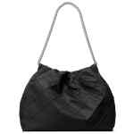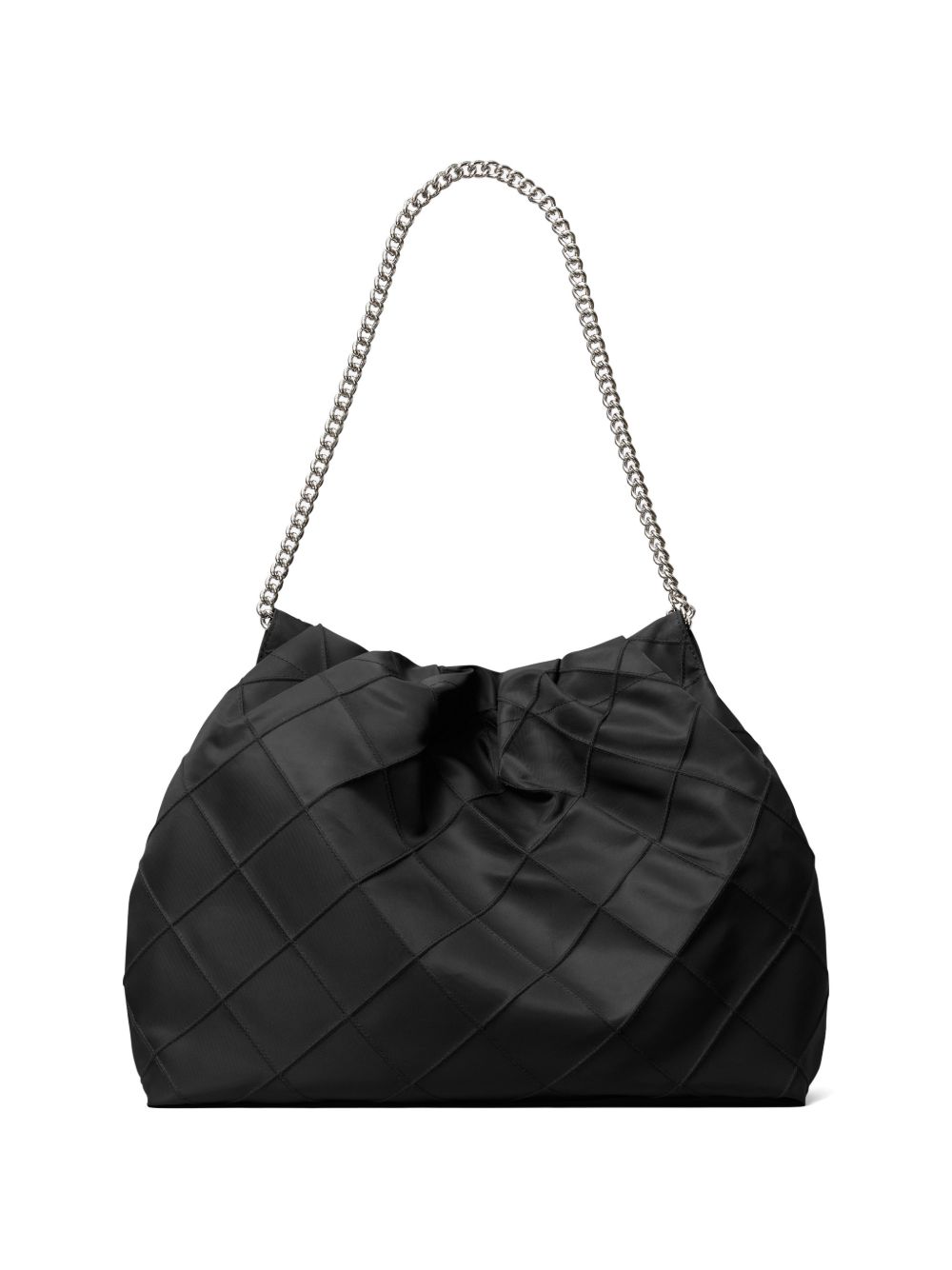 Diamond pattern pintucks get a sporty update on our Fleming Nylon Hobo Bag. Made of 100% recycled nylon, the slouchy silhouette is designed with a chain strap and Double T charm. outer shell: 100% recycled nylon; napa leather trim lining: 80% recycled polyester, 20% cotton magnetic snap closure double chain shoulder straps with 11.8″ (30cm) drop 1 interior front wall pocket, 1 interior zipper pocket hanging metal logo charm pintuck quilting technique Fleming nylon hobo bag.