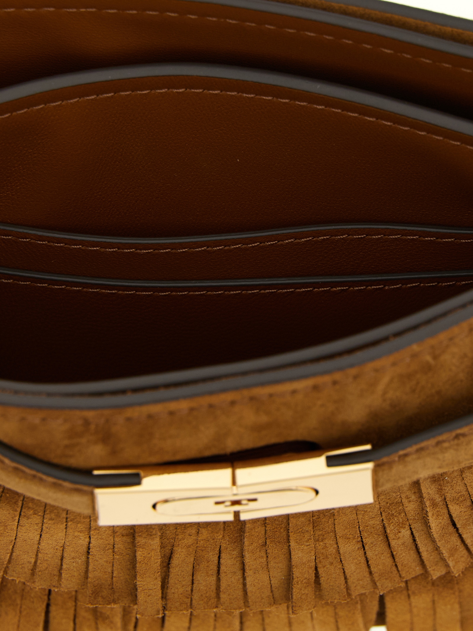 Radziwill petite Lee’ crossbody bag in suede with fringes, fixed handle, front magnetic closure with logo, adjustable and removable shoulder strap.
