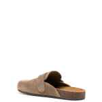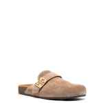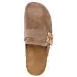camel brown calf suede signature Double T motif silver-tone logo plaque crossover strap detail slip-on style round toe branded insole flat rubber sole Mellow suede leather slippers
