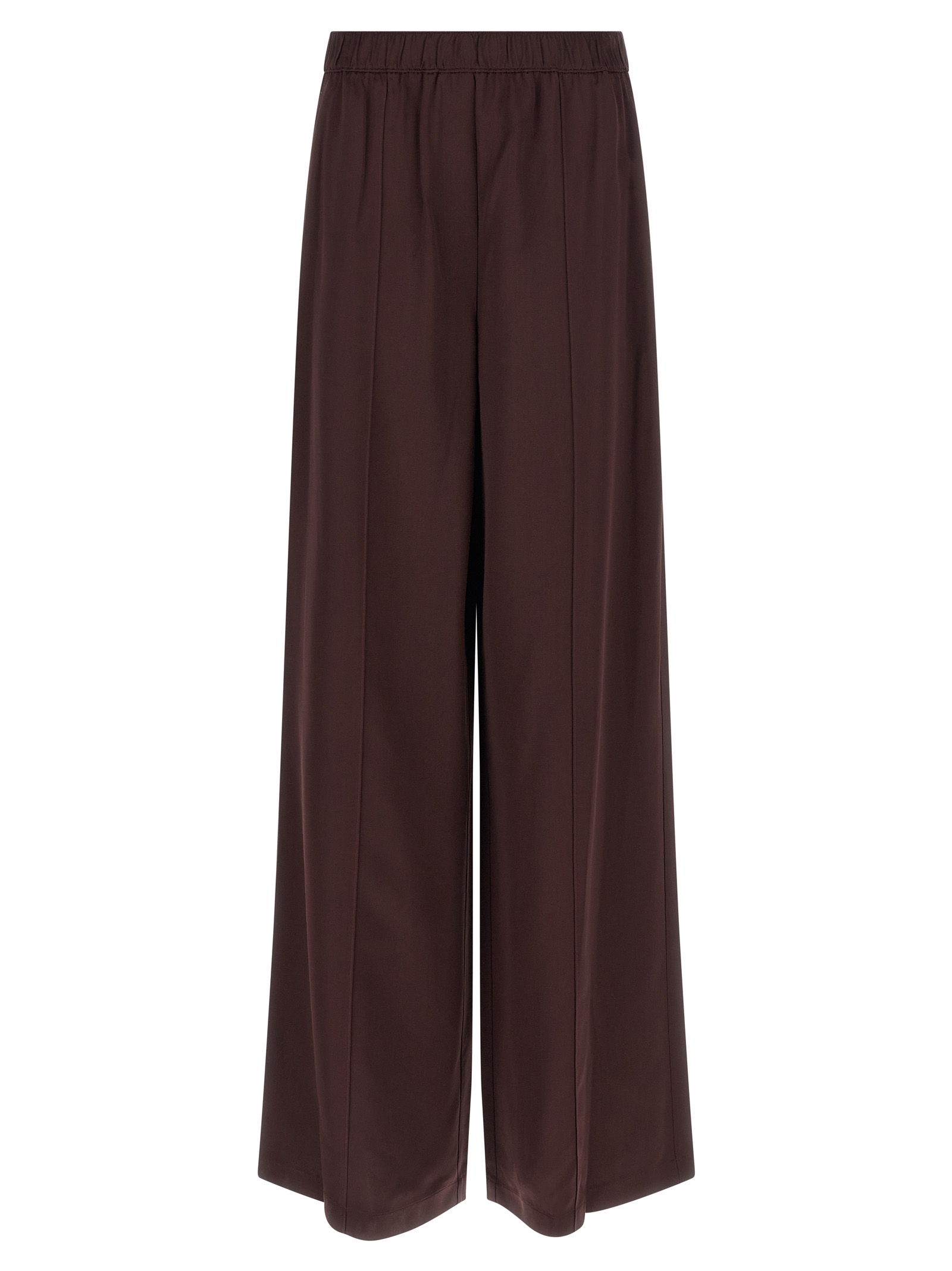 Shiny fabric trousers, straight leg, front stitching, side pockets, elastic waistband.