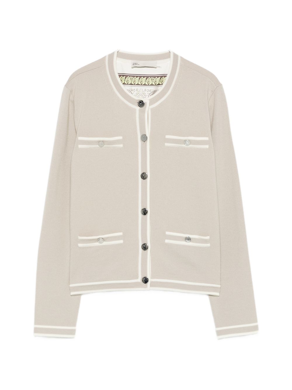 grey button fastening trim details round neck long sleeves two front pockets Wool cardigan