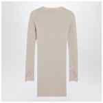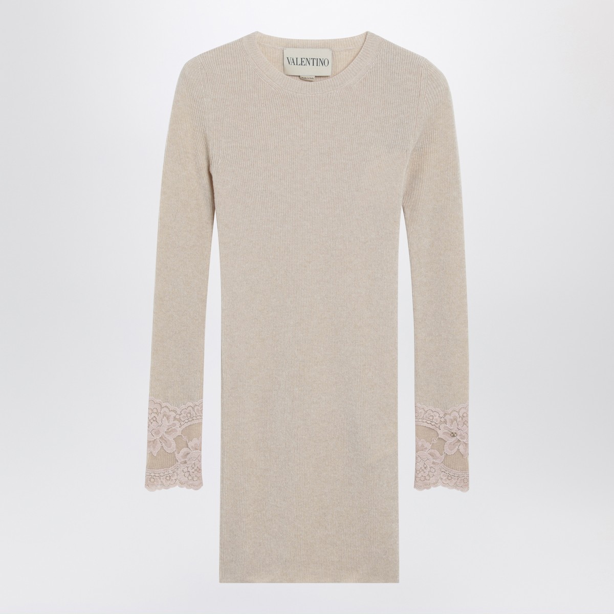 Alabaster cashmere crewneck sweater by Valentino, featuring ribbed design, long sleeves, lace-embroidered cuffs, and Vlogo detail.