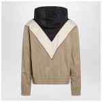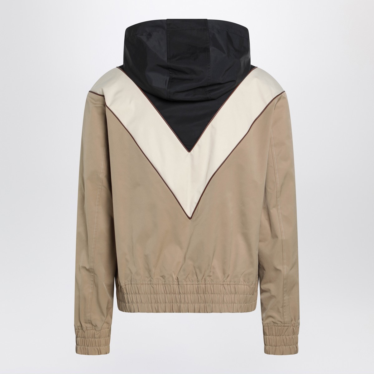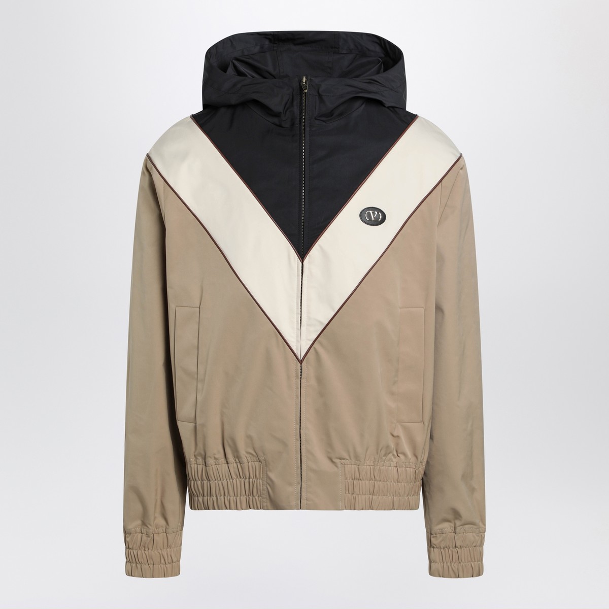 Valentino windbreaker jacket in black, butter and camel tones, featuring a front zip closure, drawstring hood, long sleeves, elasticated cuffs and hem, two side pockets and a Vlogo patch on the chest.