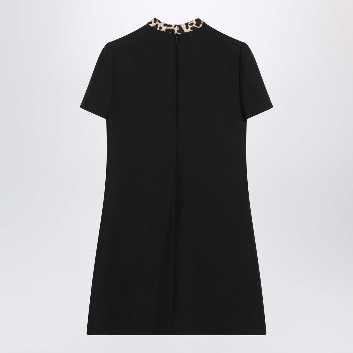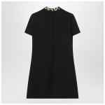 Short black Crepe Couture dress by Valentino in wool and silk blend, featuring animal-print bow with jeweled heart buttons, short sleeves, two front patch pockets, and back zip closure.
